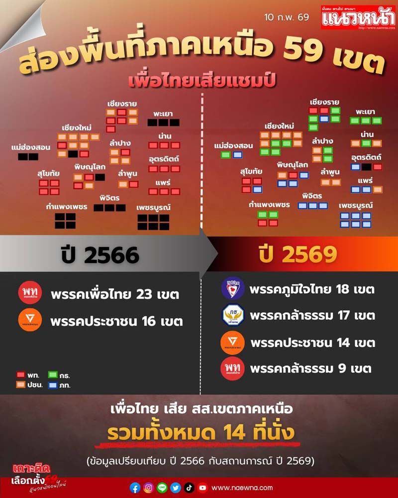 - ภาคเหนือ พรรคเพื่อไทยเหลือเพียง 9 ที่นั่ง ลดลงจากเดิม 14 ที่นั่ง ขณะที่พรรคภูมิใจไทย พรรคกล้าธรรม และพรรคประชาชน ได้ ขยับขึ้นมาครองพื้นที่แทน