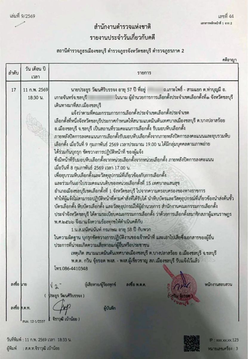 11 กุมภาพันธ์ 2569 ผู้อำนวยการการเลือกตั้งประจำเขตเลือกตั้งที่ 1 จังหวัดชลบุรี เข้าแจ้งความร้องทุกข์เพื่อให้ดำเนินคดีกับบุคคลจำนวน 2 ราย ภายหลังเกิดเหตุบุกรุกและขัดขวางการปฏิบัติหน้าที่ของเจ้าหน้าที่ ระหว่างกระบวนการรับมอบและยุบรวมหีบเลือกตั้ง