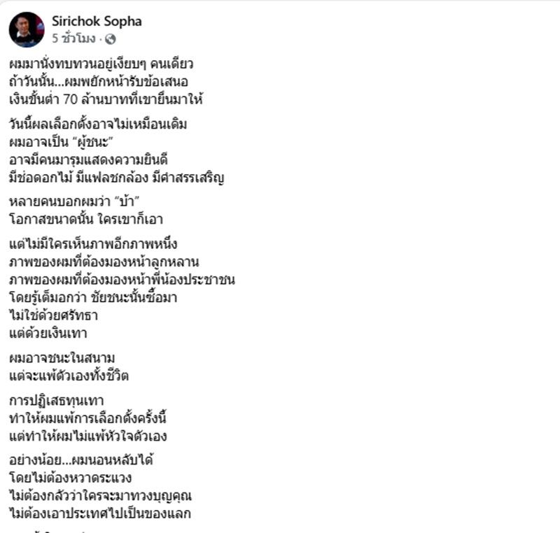 นายศิริโชค โสภา อดีต ส.ส.พรรคประชาธิปัตย์ ได้โพสต์ผ่านเฟซบุ๊ก Sirichok Sopha ระบุว่า ผมมานั่งทบทวนอยู่เงียบๆ คนเดียว ถ้าวันนั้น…ผมพยักหน้ารับข้อเสนอ เงินขั้นต่ำ 70 ล้านบาทที่เขายื่นมาให้