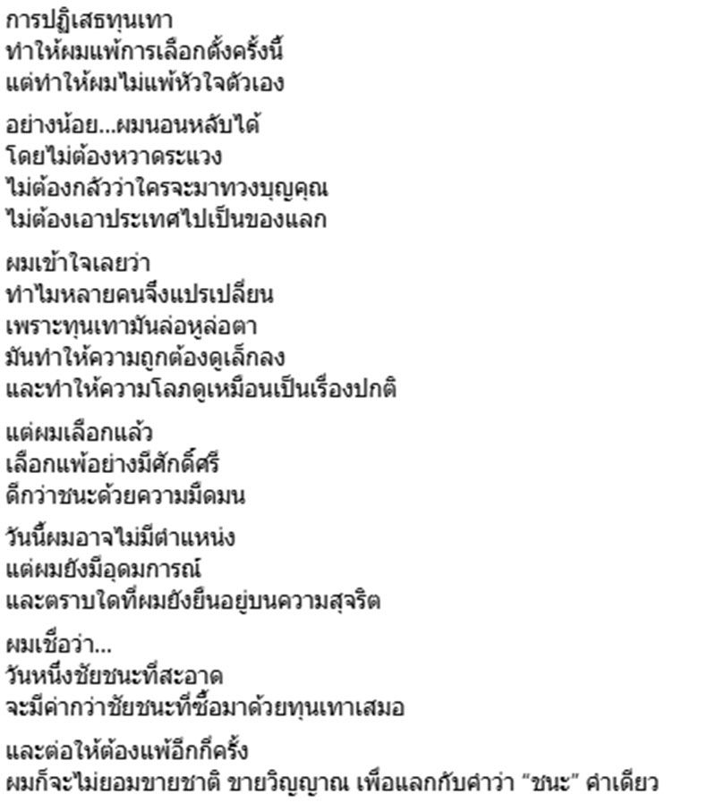 การปฏิเสธทุนเทา ทำให้ผมแพ้การเลือกตั้งครั้งนี้ แต่ทำให้ผมไม่แพ้หัวใจตัวเอง อย่างน้อย…ผมนอนหลับได้โดยไม่ต้องหวาดระแวงไม่ต้องกลัวว่าใครจะมาทวงบุญคุณไม่ต้องเอาประเทศไปเป็นของแลกผมเข้าใจเลยว่าทำไมหลายคนจึงแปรเปลี่ยนเพราะทุนเทามันล่อหูล่อตามันทำให้ความถูกต้องดูเล็กลงและทำให้ความโลภดูเหมือนเป็นเรื่องปกติแต่ผมเลือกแล้วเลือกแพ้อย่างมีศักดิ์ศรีดีกว่าชนะด้วยความมืดมนวันนี้ผมอาจไม่มีตำแหน่งแต่ผมยังมีอุดมการณ์และตราบใดที่ผมยังยืนอยู่บนความสุจริต