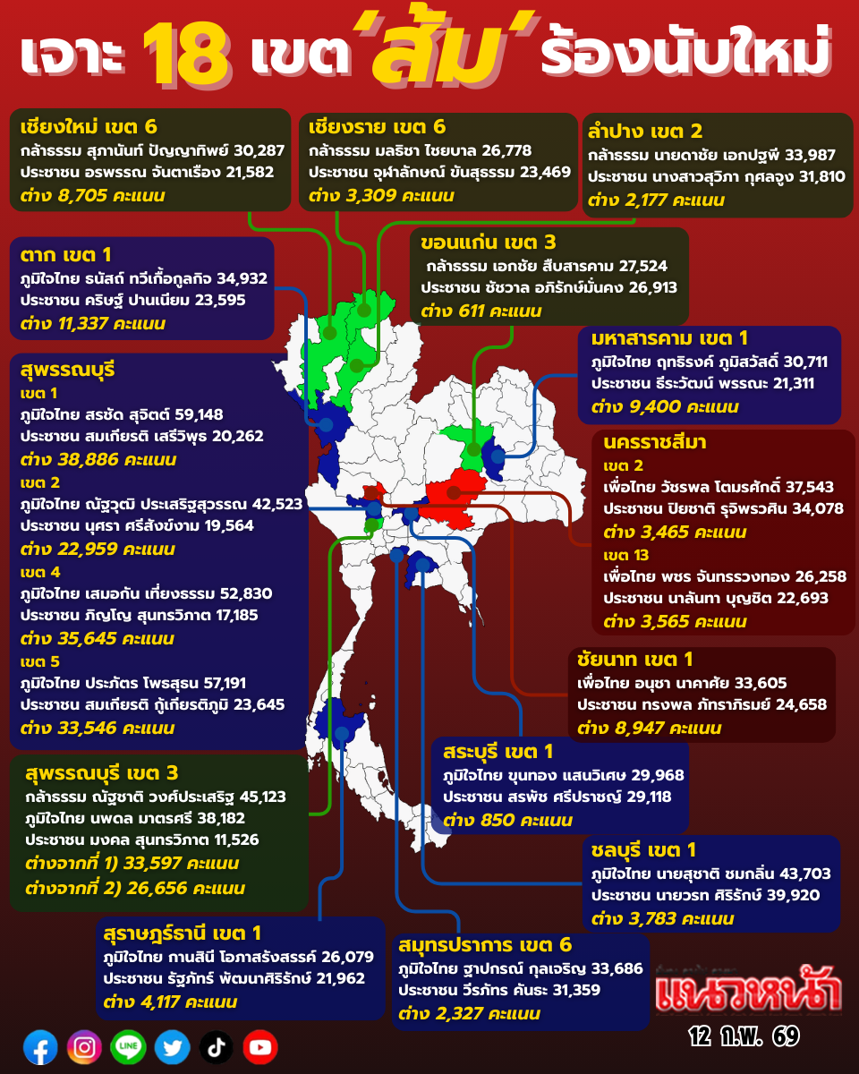 เจาะเข้าไปดูผลเลือกตั้งอย่างไม่เป็นทางการ 18 เขต พบว่า เป็นเขตที่ภูมิใจไทยชนะ 10 เขต , พรรคกล้าธรรมชนะ 5 เขต ที่เหลือ 3 เขตพรรคเพื่อไทยชนะ เห็นได้ชัดว่า เป้าหลักอยู่ที่ภูมิใจไทย กับกล้าธรรม ซึ่งเป็นที่คาดหมายมาตั้งแต่ก่อนการเลือกตั้งว่าจะเป็นพรรคหลักที่ร่วมจัดตั้งรัฐบาล ส่วนพรรคเพื่อไทยก็เริ่มมีข่าวเหมือนกันว่าอาจเป็นอีกพรรคหนึ่งที่เข้าร่วมรัฐบาล "อนุทิน2"