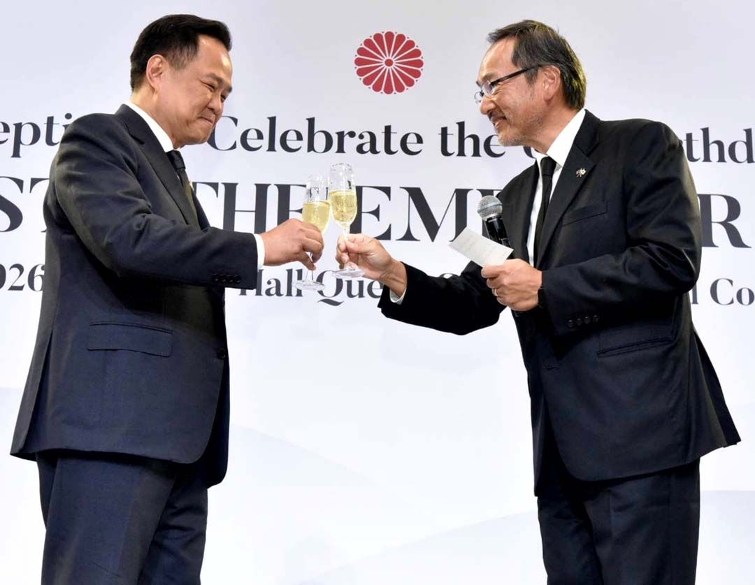 12 กุมภาพันธ์ 2569 เวลา 18.30 น. ณ ห้องเพลนารีฮอลล์ ศูนย์การประชุมแห่งชาติสิริกิติ์ เขตคลองเตย กรุงเทพฯ นายอนุทิน ชาญวีรกูล นายกรัฐมนตรี และรัฐมนตรีว่าการกระทรวงมหาดไทย เข้าร่วมงานเลี้ยงรับรองเนื่องในโอกาสวันคล้ายวันพระราชสมภพของสมเด็จพระจักรพรรดิแห่งญี่ปุ่น โดยมี นายโอตากะ มาซาโตะ (H.E. Mr. OTAKA Masato) เอกอัครราชทูตญี่ปุ่นประจำประเทศไทยให้การต้อนรับ
