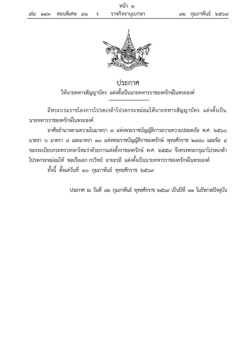 วันที่ 13 กุมภาพันธ์ 2569 เว็บไซต์ราชกิจจานุเบกษาเผยแพร่ พระบรมราชโองการ ประกาศ ให้นายทหารสัญญาบัตร แต่งตั้งเป็นนายทหารราชองครักษ์ในพระองค์ ลงวันที่ 12 กุมภาพันธ์ โดยระบุว่า มีพระบรมราชโองการโปรดเกล้าโปรดกระหม่อมให้นายทหารสัญญาบัตร แต่งตั้งเป็นนายทหารราชองครักษ์ในพระองค์
