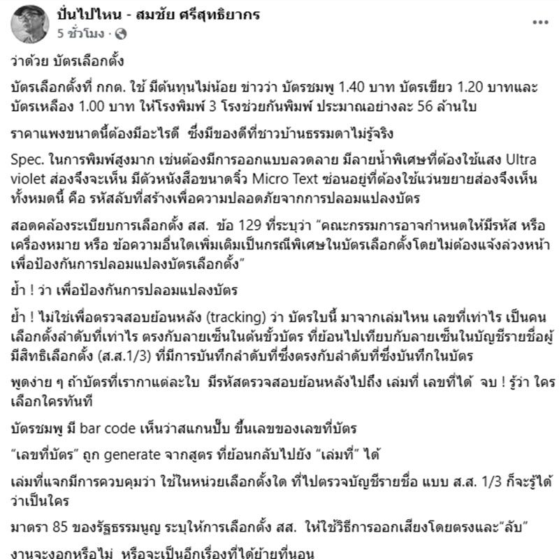 วันที่ 13 กุมภาพันธ์ 2569 นายสมชัย ศรีสุทธิยากร อดีต กกต.และนักวิชาการ โพสต์ข้อความระบุว่า ว่าด้วย บัตรเลือกตั้ง