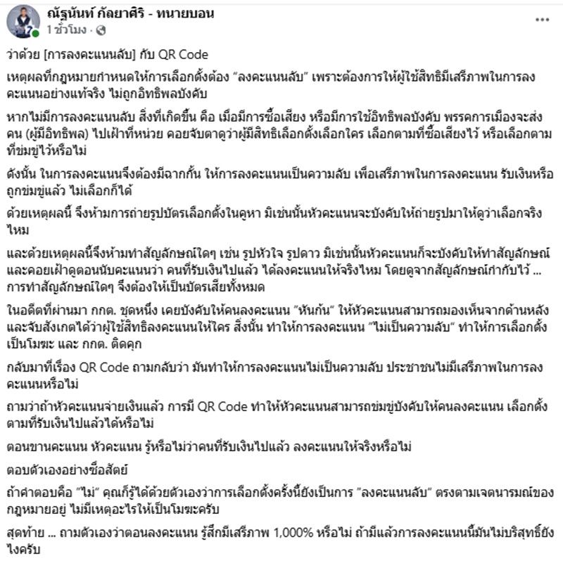 ซึ่งทาง ทนายบอน ก็โพสต์ว่า ว่าด้วย [การลงคะแนนลับ] กับ QR Code