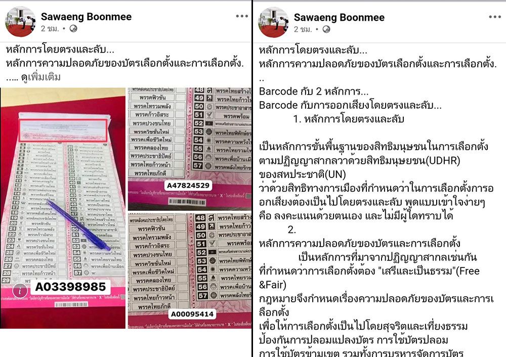 และ 4.บาร์โค้ดกับการออกเสียงโดยตรงและลับ การใช้บาร์โค้ดในบัตรเลือกตั้ง กรณีประชาชนที่ไปสังเกตการณ์การเลือกตั้งถ่ายรูปบัตรที่มีบาร์โค้ดจะทราบว่าผู้มีสิทธิเลือกตั้งลงคะแนนให้ใครแล้วหรือไม่ ขอยืนยันว่าไม่ทราบอย่างแน่นอน แต่หากมีผู้พยามอยากจะทราบว่าผู้มีสิทธิเลือกตั้งลงคะแนนให้ใคร เป็นการทำให้การเลือกตั้งไม่สุจริตและเที่ยงธรรม เป็นคนละส่วนกับการลงคะแนนโดยตรงและลับ ก็มีมาตรการในการให้การเลือกตั้งเป็นไปโดยตรงและลับ ตามที่ได้กล่าวมาแล้วในข้อ 3 คือ การเก็บบัตร ต้นขั้วบัตร บัตรชีรายชื่อ แยกจากกัน ในที่ปลอดภัย ไม่มีผู้ใดจะเข้าถึงได้โดยไม่มีคำสั้งศาล และหากจะเปิดหีบตามคำสั่งศาลก็เพื่อการเลือกตั้งที่มีการร้องว่าการเลือกตั้งไม่ได้เป็นไปโดยสุจริตและเที่ยงธรรมเท่านั้น และการเปิดหีบเอกสารก็จะเปิดเท่าทีจำเป็น หีบใดหีบหนึ่งที่เกี่ยวกับคำร้องไม่ได้เปิดเอกสารทั้ง 3 อย่างพร้อมกัน