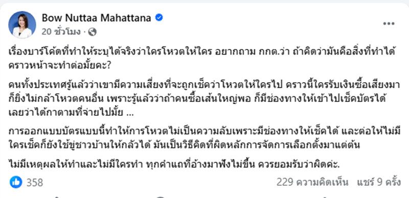 วันที่ 16 กุมภาพันธ์ 2569 น.ส.ณัฏฐา มหัทธนา หรือโบว์ นักวิเคราะห์ข่าว และนักกิจกรรมนักเคลื่อนไหวทางการเมือง แสดงความเห็นผ่านเฟซบุ๊ก ระบุว่า เรื่องบาร์โค้ดที่ทำให้ระบุได้จริงว่าใครโหวตให้ใคร อยากถาม กกต.ว่า ถ้าคิดว่ามันคือสิ่งที่ทำได้ คราวหน้าจะทำต่อมั้ยคะ?