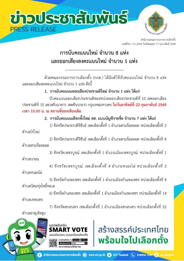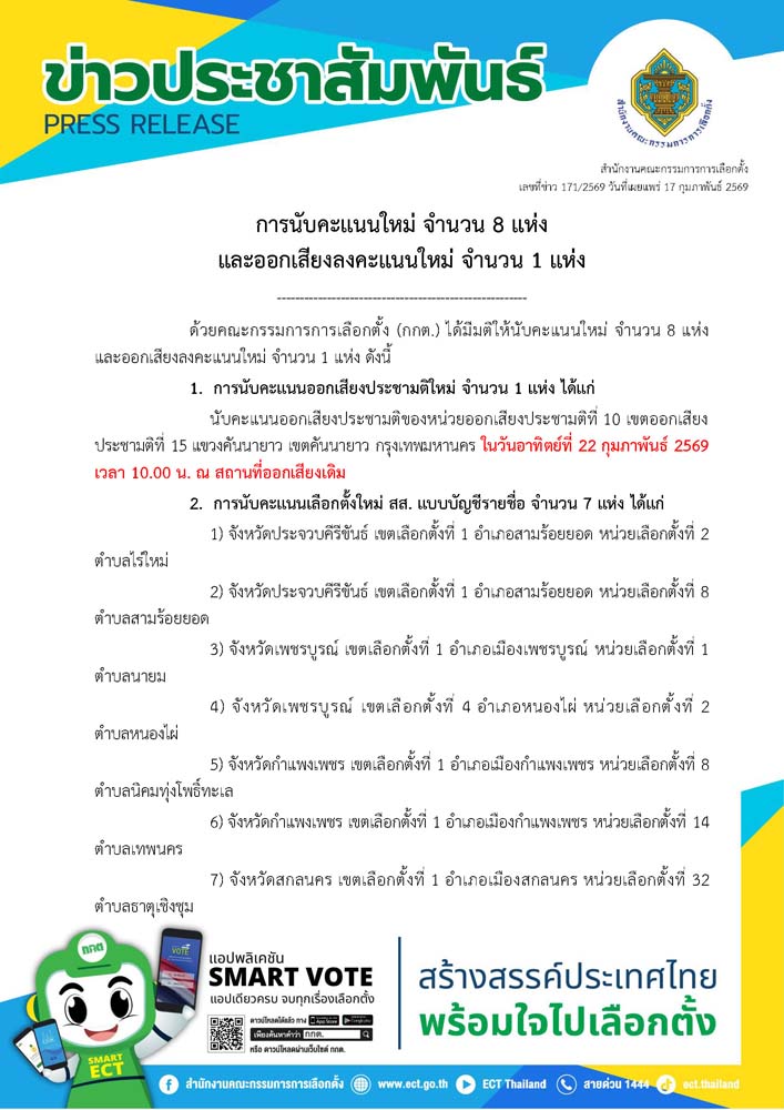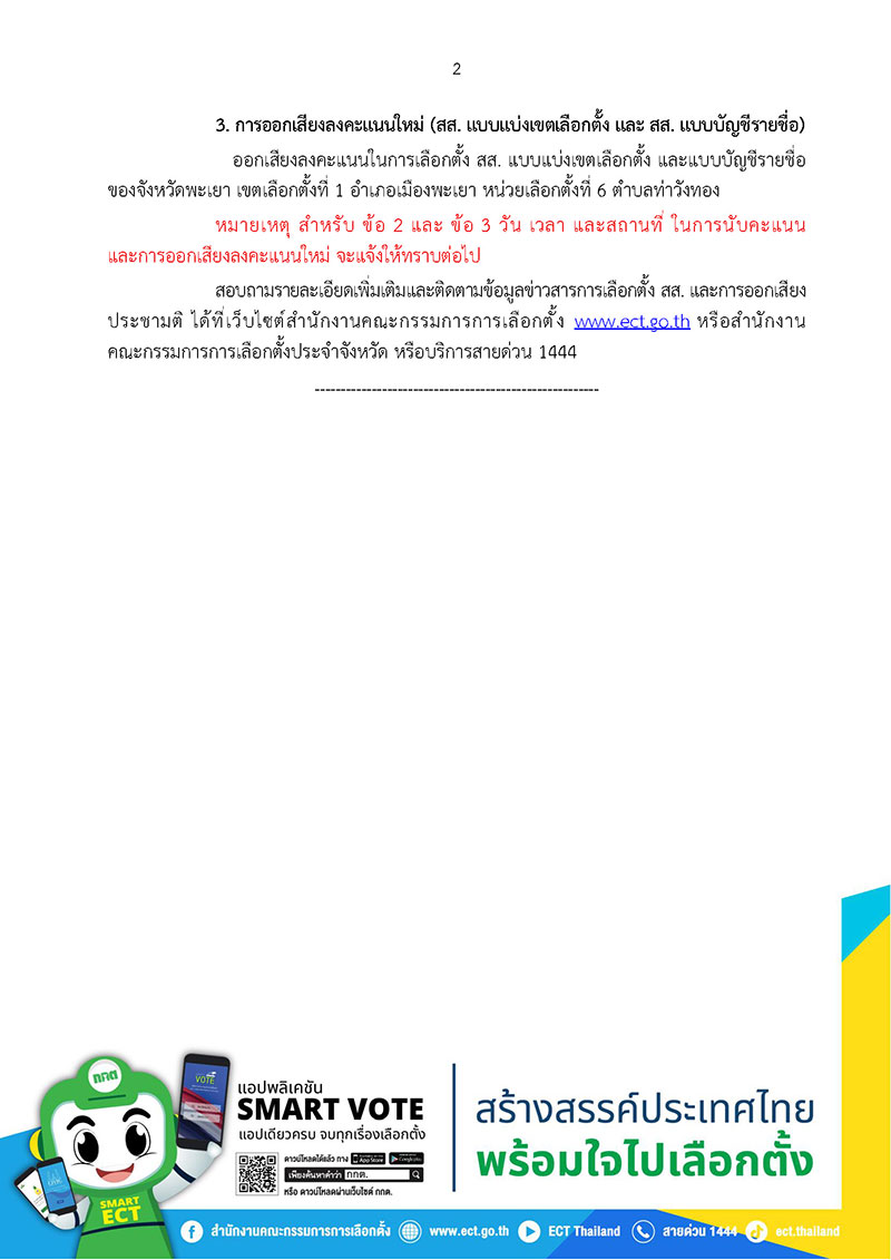 ทั้งนี้ สำหรับ ข้อ 2 และ ข้อ 3 วัน เวลา และสถานที่ ในการนับคะแนนและการออกเสียงลงคะแนนใหม่ จะแจ้งให้ทราบต่อไป สอบถามรายละเอียดเพิ่มเติมและติดตามข้อมูลข่าวสารการเลือกตั้ง สส. และการออกเสียงประชามติ ได้ที่เว็บไซต์สำนักงานคณะกรรมการการเลือกตั้ง www.ect.go.th หรือสำนักงานคณะกรรมการการเลือกตั้งประจำจังหวัด หรือบริการสายด่วน 1444