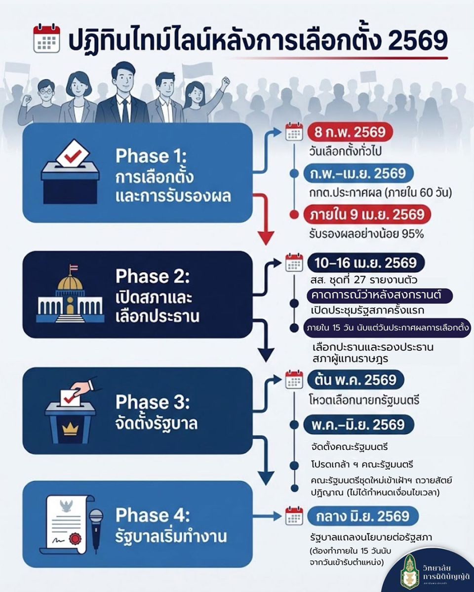 18 กุมภาพันธ์ 2569 เพจเฟซบุ๊ก "สถาบันพระปกเกล้า" ได้เปิดเผยถึงปฏิทินไทม์ไลน์หลังการเลือกตั้ง 2569 ตั้งแต่วันเลือกตั้ง ในวันที่ 8 ก.พ.และคาดการณ์ว่าในช่วงระหว่างเดือน ก.พ.จนถึงเดือน เม.ย.2569 จะเป็นช่วง กกต.พิจารณาประกาศรับรองผลการเลือกตั้งภายใน 60 วัน ตามกรอบที่กฎหมายกำหนด หรือภายในวันที่ 9 เม.ย.2569 ซึ่งจะต้องรับรองผลการเลือกตั้งอย่างน้อยร้อยละ 95 และคาดการณ์ว่า สภาผู้แทนราษฎรชุดที่ 27 จะเข้ารายงานตัวได้ในช่วงวันที่ 10 - 16 เม.ย.2569 ก่อนที่จะเปิดสภา และเข้าสู่วาระการเลือกประธานสภาผู้แทนราษฎร คาดว่าจะเป็นช่วงหลังเทศกาลสงกรานต์ ซึ่งตามกฎหมายกำหนดภายใน 15 วัน นับแต่วันประกาศผลการเลือกตั้ง จากนั้นจะกำหนดวันเลือกประธานและรองประธานสภาผู้แทนราษฎร