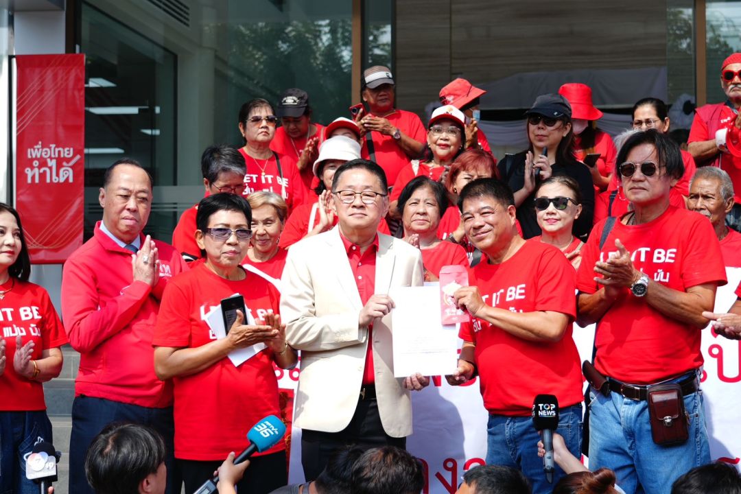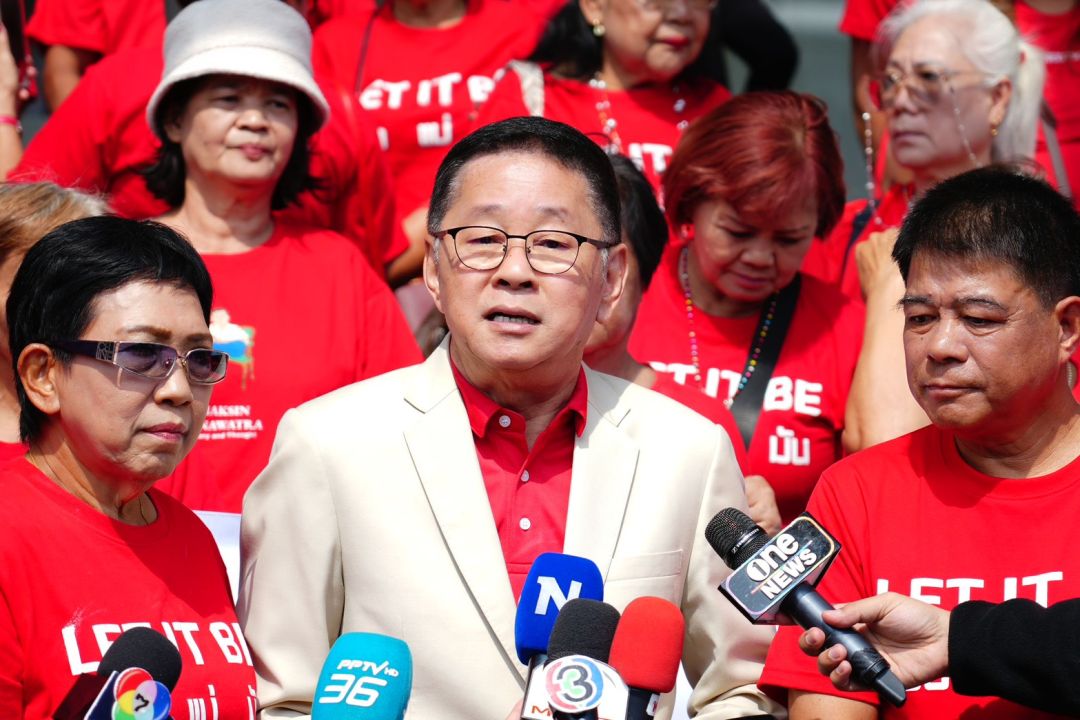 เมื่อเวลา 10.00 น. วันที่ 19 ก.พ.2569 ที่พรรคเพื่อไทย นายประเสริฐ จันทรรวงทอง เลขาธิการพรรค รับมอบแถลงการณ์จากคนเสื้อแดง กลุ่มพปศ. หรือกลุ่มเพื่อชาติประชาธิปไตยและคนที่เรารักศรัทธา ยื่นข้อเสนอแนะ 3 ข้อสนับสนุนพรรคเพื่อไทยในการเข้าร่วมรัฐบาล โดยมีป้ายข้อความ "เลือกเพื่อไทย...มาเป็นรัฐบาล ไปทำงาน....เพื่อประชาชน" และใส่เสื้อแดง ข้อความ “lET IT BE ช่าง แม่ มัน“ มาด้วย