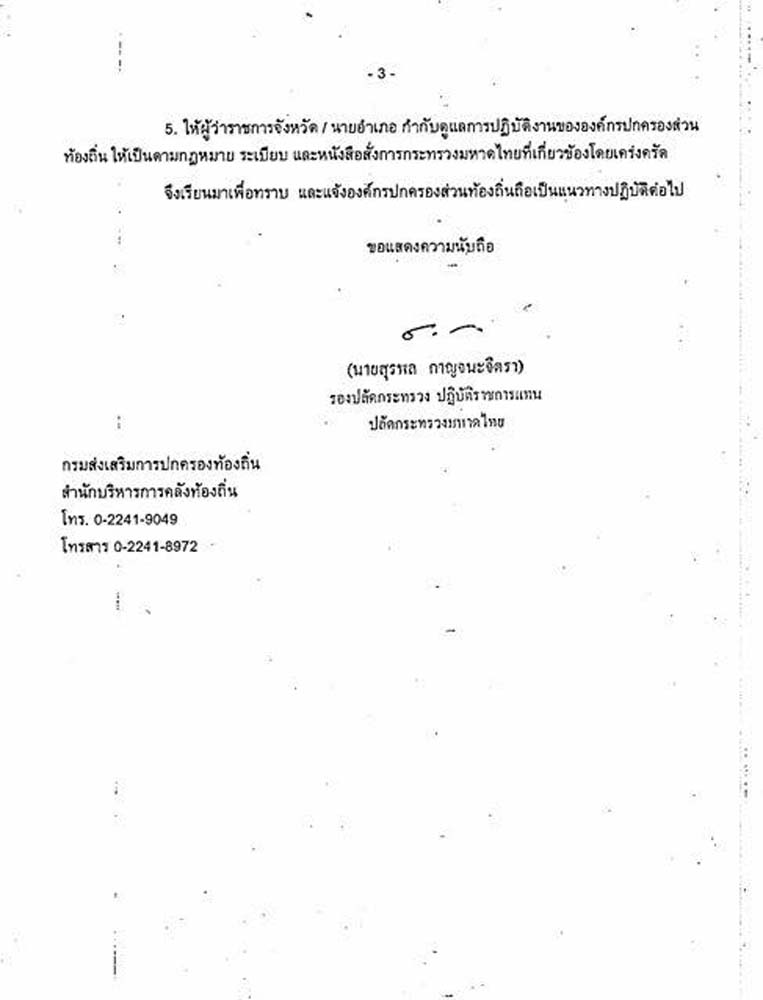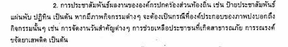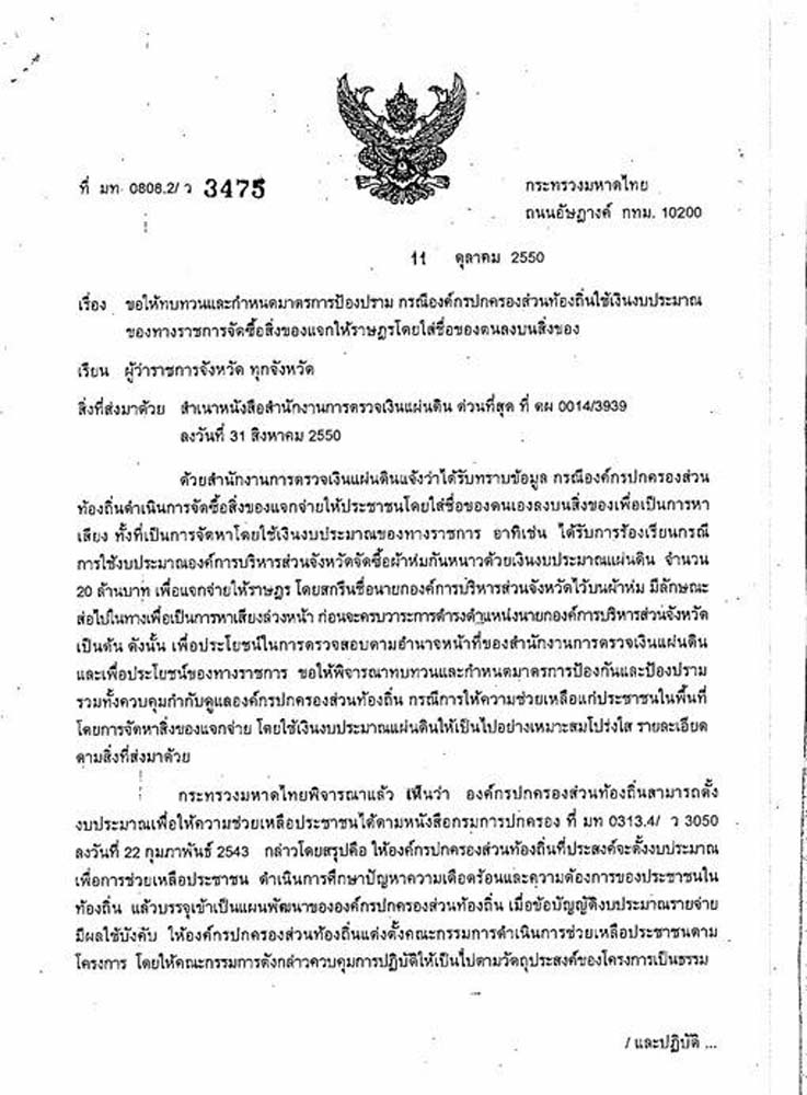การดำเนินการดังกล่าวเป็นไปตามแนวทางของกระทรวงมหาดไทย ที่กำหนดให้องค์กรปกครองส่วนท้องถิ่น สามารถประชาสัมพันธ์ภารกิจของหน่วยงานได้ เพื่อประโยชน์ของประชาชนและทางราชการ ตามหนังสือกระทรวงมหาดไทยที่ มท 0808.2/ว 3475 ลงวันที่ 11 ต.ค.2550 เรื่องขอให้ทบทวนและกำหนดมาตรการป้องปราม กรณีองค์กรปกครองส่วนท้องถิ่นใช้เงินงบประมาณ ของทางราชการจัดซื้อสิ่งของแจกให้ราษฎรโดยใส่ชื่อของคนลงบนสิ่งของ