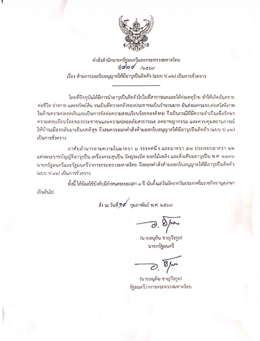 เมื่อวันที่ 20 ก.พ.2569 นายอนุทิน ชาญวีรกูล นายกรัฐมนตรี และรัฐมนตรีว่าการกระทรวงมหาดไทย ได้ลงนามในคำสั่งสำนักนายกรัฐมนตรีและกระทรวงมหาดไทย ที่429/2569 วันที่ 19 ก.พ.ที่ผ่านมา เรื่องห้ามการออกใบอนุญาตให้มีอาวุธปืนติดตัว (แบบ ป.12) เป็นการชั่วคราว มีเนื้อหาระบุว่า โดยที่ปัจจุบันได้มีการนำอาวุธปืนติดตัวไปในที่สาธารณะและได้ก่อเหตุร้าย ทำให้เกิดอันตราย ต่อชีวิต ร่างกาย และทรัพย์สิน จนเป็นที่หวาดกลัวของประชาขนเป็นจำนวนมาก อันส่งผลกระทบต่อสวัสติภาพในด้านความปลอดภัยและเป็นการขัดต่อความสงบเรียบร้อยของสังคม