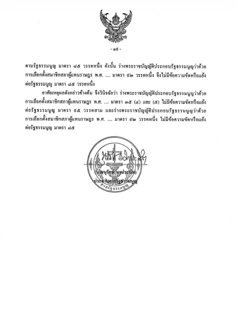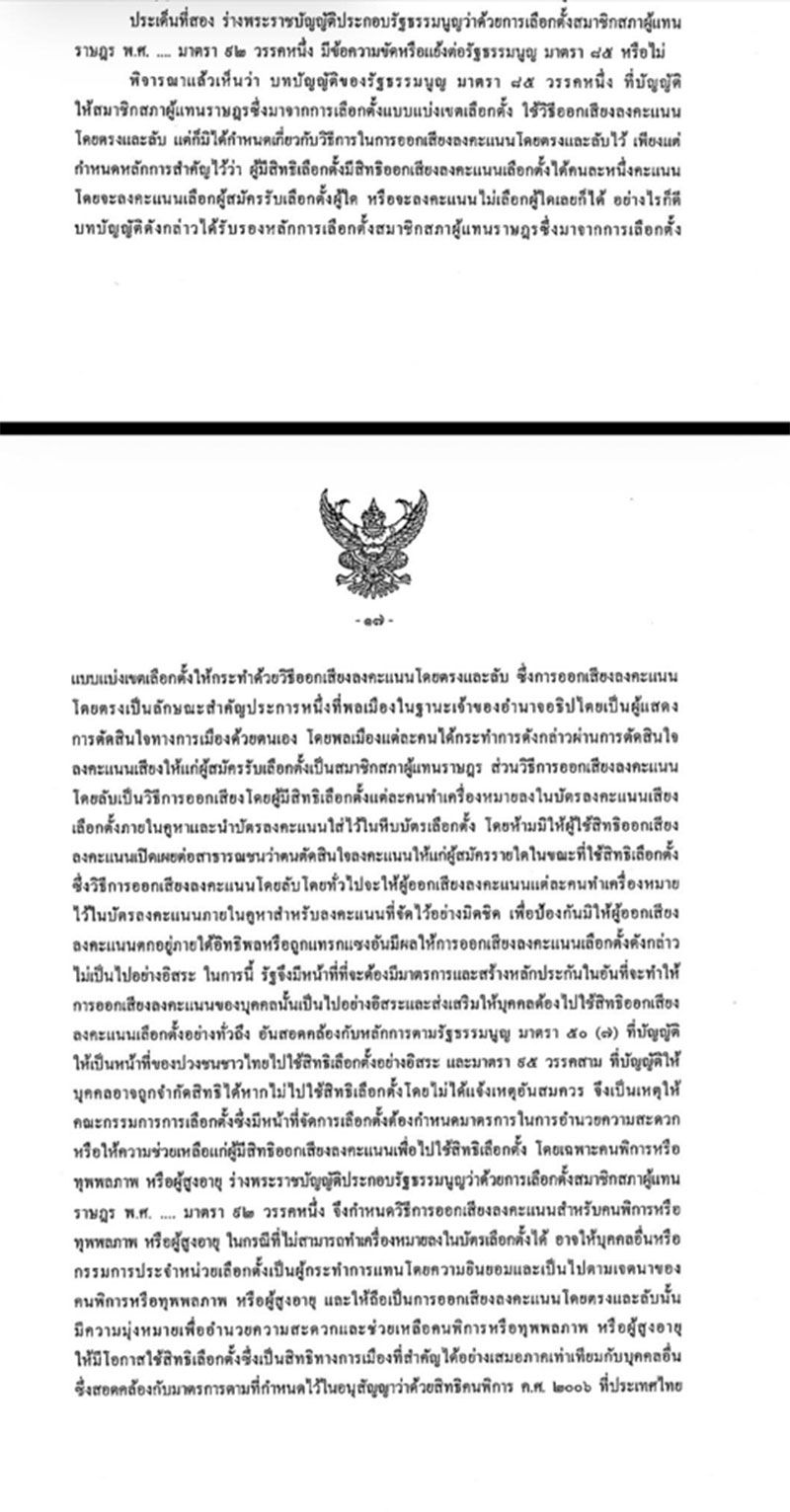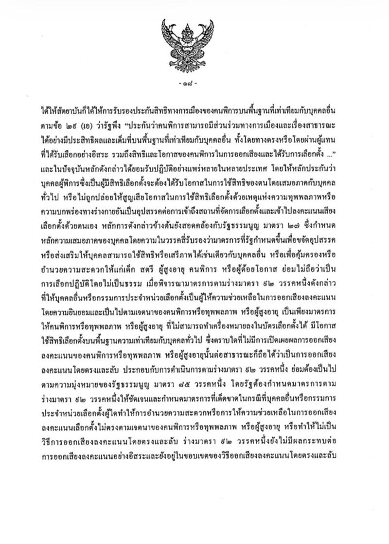 เปิดคำวินิจฉัยศาลรัฐธรรมนูญที่ 3/2561 วินิจฉัยคำร้องกรณีร่าง พรบ.ประกอบรัฐธรรมนูญว่าด้วยการเลือกตั้งสมาชิกสภาผู้แทนราษฎร มาตรา 92 "เพื่ออํานวยความสะดวกให้แก่คนพิการหรือทุพพลภาพ หรือผู้สูงอายุ ในการออกเสียงลงคะแนน ให้คณะกรรมการหรือผู้ซึ่งคณะกรรมการมอบหมายจัดให้มีการอํานวยความสะดวกสําหรับการออกเสียงลงคะแนนของบุคคลดังกล่าวไว้เป็นพิเศษ หรือจัดให้มีการช่วยเหลือในการออกเสียงลงคะแนนภายใต้การกํากับดูแลของคณะกรรมการประจําหน่วยเลือกตั้ง ในการให้ความช่วยเหลือดังกล่าวต้องให้บุคคลนั้นได้ออกเสียงลงคะแนนด้วยตนเองตามเจตนาของบุคคลนั้น เว้นแต่ลักษณะทางกายภาพทําให้คนพิการหรือทุพพลภาพ หรือผู้สูงอายุไม่สามารถทําเครื่องหมายลงในบัตรเลือกตั้งได้ ให้บุคคลอื่นหรือกรรมการประจําหน่วยเลือกตั้งเป็นผู้กระทําการแทน โดยความยินยอมและเป็นไปตามเจตนาของคนพิการหรือทุพพลภาพ หรือผู้สูงอายุนั้น ทั้งนี้ ให้ถือเป็นการออกเสียงลงคะแนนโดยตรงและลับ" มีข้อความขัดหรือแย้งกับรัฐธรรมูญมาตรา 85 หรือไม่