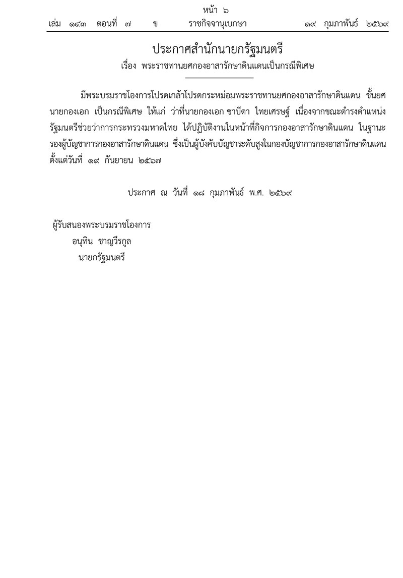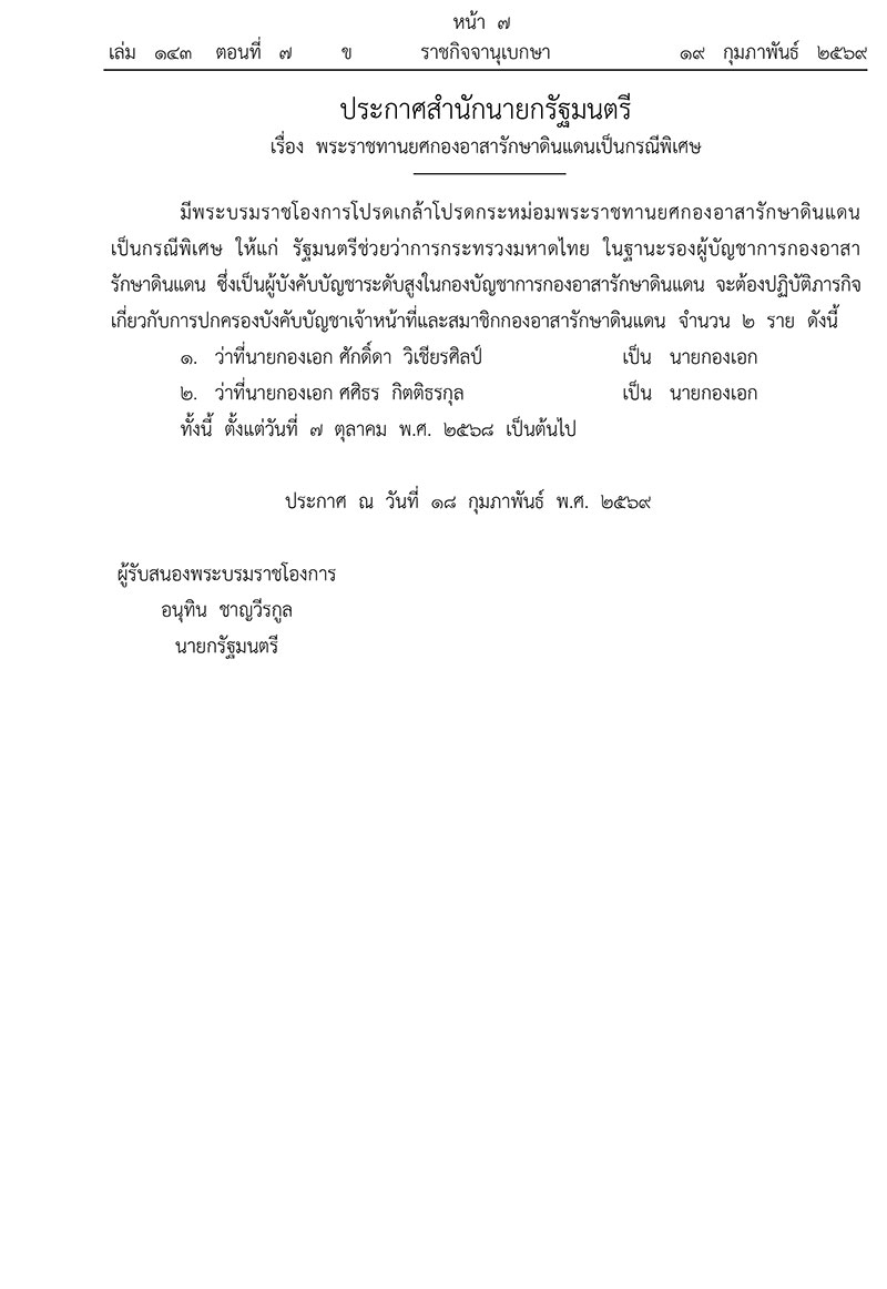 วันที่ 20 กุมภาพันธ์ 2569 เว็บไซต์ราชกิจจานุเบกษา เผยแพร่เรื่อง พระราชทานยศกองอาสารักษาดินแดนเป็นกรณีพิเศษ