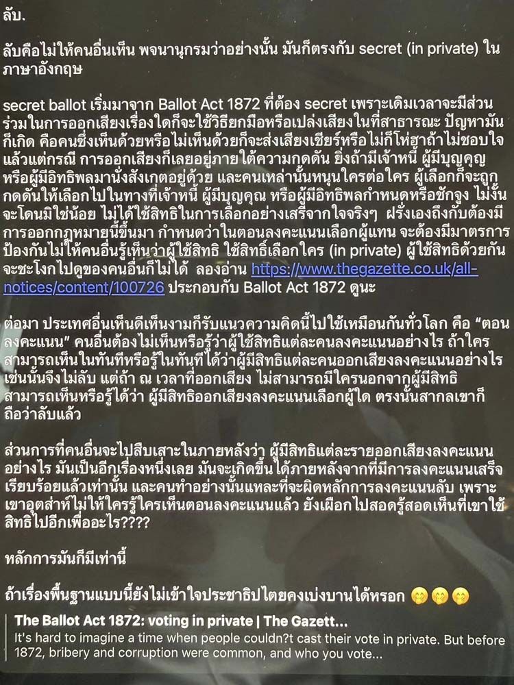 ในฐานะที่เป็นผู้สอนวิชากฏหมายรัฐธรรมนูญ และกฎหมายมหาชนมา 40 ปี ผมก็ต้องมานั่งทบทวนความรู้ของตัวเอง ว่าอะไรคือการเลือกตั้ง“โดยลับ” secret vote