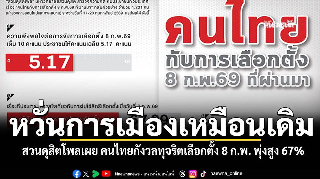 22 กุมภาพันธ์ 2569 “สวนดุสิตโพล” มหาวิทยาลัยสวนดุสิต สำรวจความคิดเห็นประชาชนทั่วประเทศ เรื่อง “คนไทยกับการเลือกตั้ง 8 ก.พ.69 ที่ผ่านมา” กลุ่มตัวอย่างจำนวน 1,231 คน (สำรวจทางออนไลน์และภาคสนาม) ระหว่างวันที่ 17-20 กุมภาพันธ์ 2569 ผลการสำรวจ พบว่า กลุ่มตัวอย่างให้คะแนนความพึงพอใจต่อการจัดการเลือกตั้งเฉลี่ย 5.17 คะแนน สำหรับประเด็นที่กังวลเกี่ยวกับการไปใช้สิทธิ พบว่า ร้อยละ 67.99 กังวลเรื่องความไม่โปร่งใสและการทุจริตในการเลือกตั้ง ขณะที่ร้อยละ 40.45 ระบุถึงขั้นตอนที่ยุ่งยากหรือความสับสนในหน่วยเลือกตั้ง เมื่อพิจารณาการทำงานของ กกต. ร้อยละ 33.68 ระบุว่า ไม่ค่อยพึงพอใจ และเมื่อประเมินผลต่อภาพรวมการเมืองไทย ร้อยละ 49.31 เห็นว่าการเลือกตั้งครั้งนี้อาจจะทำให้สถานการณ์“เหมือนเดิม”