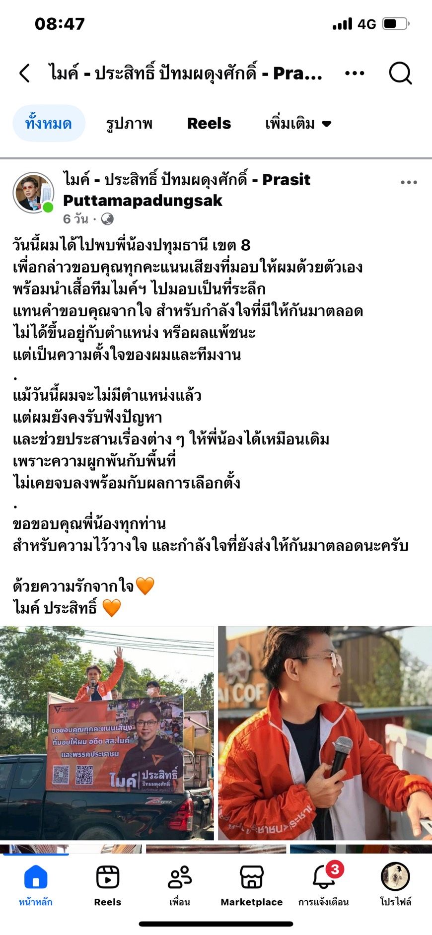 เมื่อวันที่ 22 ก.พ.2569 ผู้สื่อข่าวรายงานว่า นายประสิทธิ์ ปัทมผดุงศักดิ์ อดีตสส.ปทุมธานี เขต7 เเละผู้สมัคร สส.ปทุม ธานี เขต 8 พรรคประชาชน ได้โพสต์ข้อความลงเฟซบุ๊ก ช่วง 6 วันก่อนหน้านี้ โดยลงข้อความเเละภาพของนายประสิทธิ์ เเละทีมงานช่วงลงพื้นที่ในห้วงเวลาดังกล่าวว่า “วันนี้ผมได้ไปพบพี่น้องปทุมธานี เขต 8 เพื่อกล่าวขอบคุณทุกคะแนนเสียงที่มอบให้ผมด้วยตัวเอง พร้อมนำเสื้อทีมไมค์ฯ ไปมอบเป็นที่ระลึกแทนคำขอบคุณจากใจ สำหรับกำลังใจที่มีให้กันมาตลอดไม่ได้ขึ้นอยู่กับตำแหน่ง หรือผลแพ้ชนะ แต่เป็นความตั้งใจของผมและทีมงาน