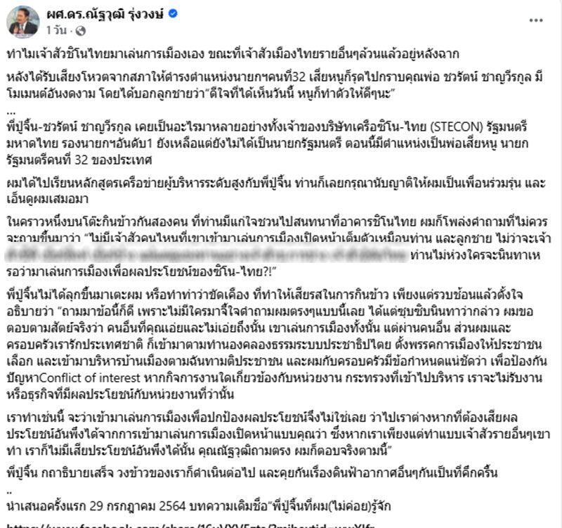 วันที่ 24 กุมภาพันธ์ 2569 ผศ.ดร.ณัฐวุฒิ รุ่งวงษ์ นักวิชาการด้านเศรษฐศาสตร์และการเมือง ผู้เชี่ยวชาญด้านการลงทุน ประธานบริษัทหลักทรัพย์ที่ปรึกษาการลงทุน ต้นธารคอร์ปอเรชั่น โพสต์ข้อความผ่านเฟซบุ๊กถึง นายชวรัตน์ ชาญวีรกูล บิดานายอนุทิน ชาญวีรกูล นายกรัฐมนตรี