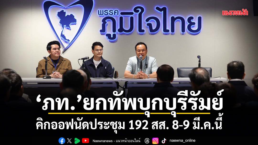 "ภท."ยกทัพบุกบุรีรัมย์ คิกออฟนัดประชุม 192 สส. 8-9 มี.ค.นี้ จับตาไฮไลต์เคาะเลือก"พรรคร่วมฯ"จัดตั้งรัฐบาล - สะท้อนความต้องการ ปชช.จัดทำนโยบายแถลงต่อรัฐสภา