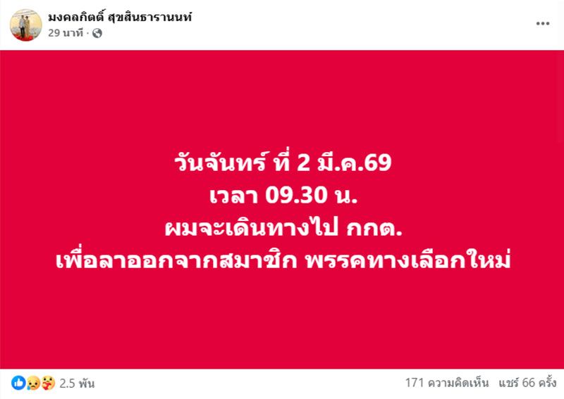 ล่าสุด นาย มงคลกิตติ์ สุขสินธารานนท์ ได้โพสต์ข้อความระบุว่า วันจันทร์ ที่ 2 มี.ค.69 เวลา 09.30 น. ผมจะเดินทางไป กกต. เพื่อลาออกจากสมาชิก พรรคทางเลือกใหม่