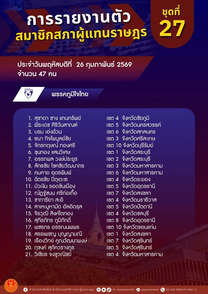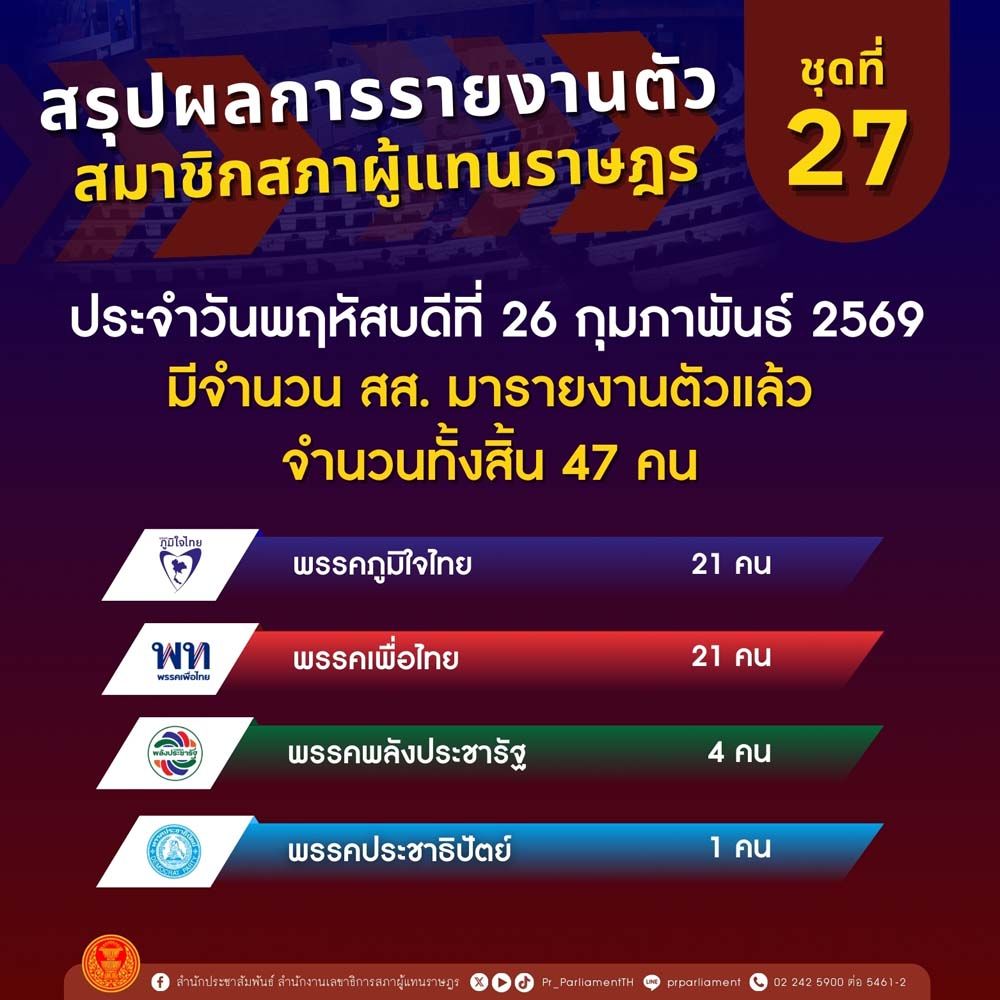 26 กุมภาพันธ์ 2569 ที่บริเวณโถงชั้น B1 อาคารรัฐสภา ผู้สื่อข่าวรายงานบรรยากาศการเปิดรับรายงานตัวสมาชิกสภาผู้แทนราษฎร (สส.) ชุดที่ 27 โดยสำนักเลขาธิการสภาผู้แทนราษฎร เป็นวันแรก ภายหลังคณะกรรมการการเลือกตั้ง (กกต.) ประกาศรับรองผลการเลือกตั้ง สส.แบบแบ่งเขต จำนวน 396 คน และให้ผู้ได้รับเลือกตั้งดังกล่าวรับหนังสือรับรองที่ กกต.ก่อนมารายงานตัว สส.ที่รัฐสภา