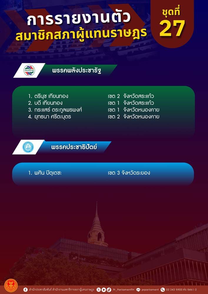 พรรคเพื่อไทย 21 คน ได้แก่ 1.นายรวี เล็กอุทัย สส.อุตรดิตถ์ พรรคเพื่อไทย 2.นายเชิงชาย ชาลีรินทร์ สส.ชัยภูมิ พรรคเพื่อไทย 3.นางหทัยรัตน์ เพชรพนมพร สส.อุดรธานี พรรคเพื่อไทย 4.นายวัชระพล ขาวขำ สส.อุดรธานี พรรคเพื่อไทย 5.นางเทียบจุฑา ขาวขำ สส.อุดรธานี พรรคเพื่อไทย 6.นายไตรภพ คำเพชร สส.อุดรธานี พรรคเพื่อไทย 7.นายศุภชัย นพขำ สส.ปทุมธานี พรรคเพื่อไทย 8.นายณัฐวัชต์ พิมพะนิตย์ สส.กาฬสินธุ์ พรรคเพื่อไทย 9.นายวิรัช พิมพะนิตย์ สส.กาฬสินธุ์ พรรคเพื่อไทย 10.นายพลากร พิมพะนิตย์ สส.กาฬสินธุ์ พรรคเพื่อไทย