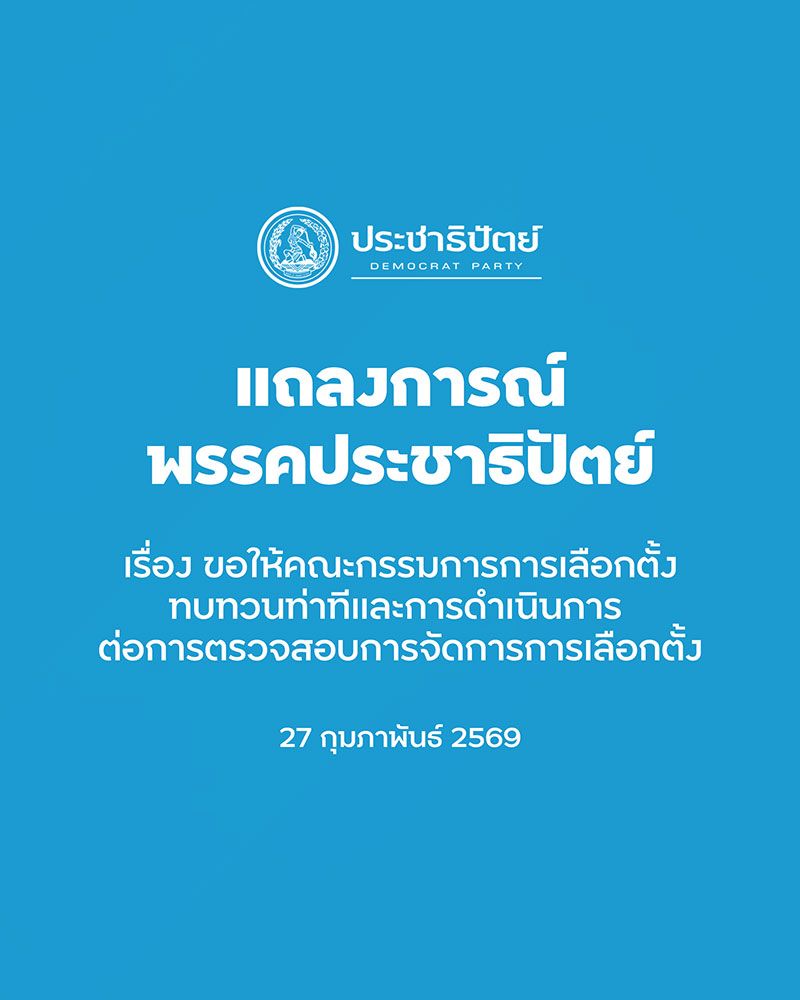 วันที่ 27 กุมภาพันธ์ 2569 พรรคประชาธิปัตย์ ออก แถลงการณ์ เรื่อง ขอให้คณะกรรมการการเลือกตั้ง ทบทวนท่าที และการดำเนินการต่อการตรวจสอบการจัดการการเลือกตั้ง