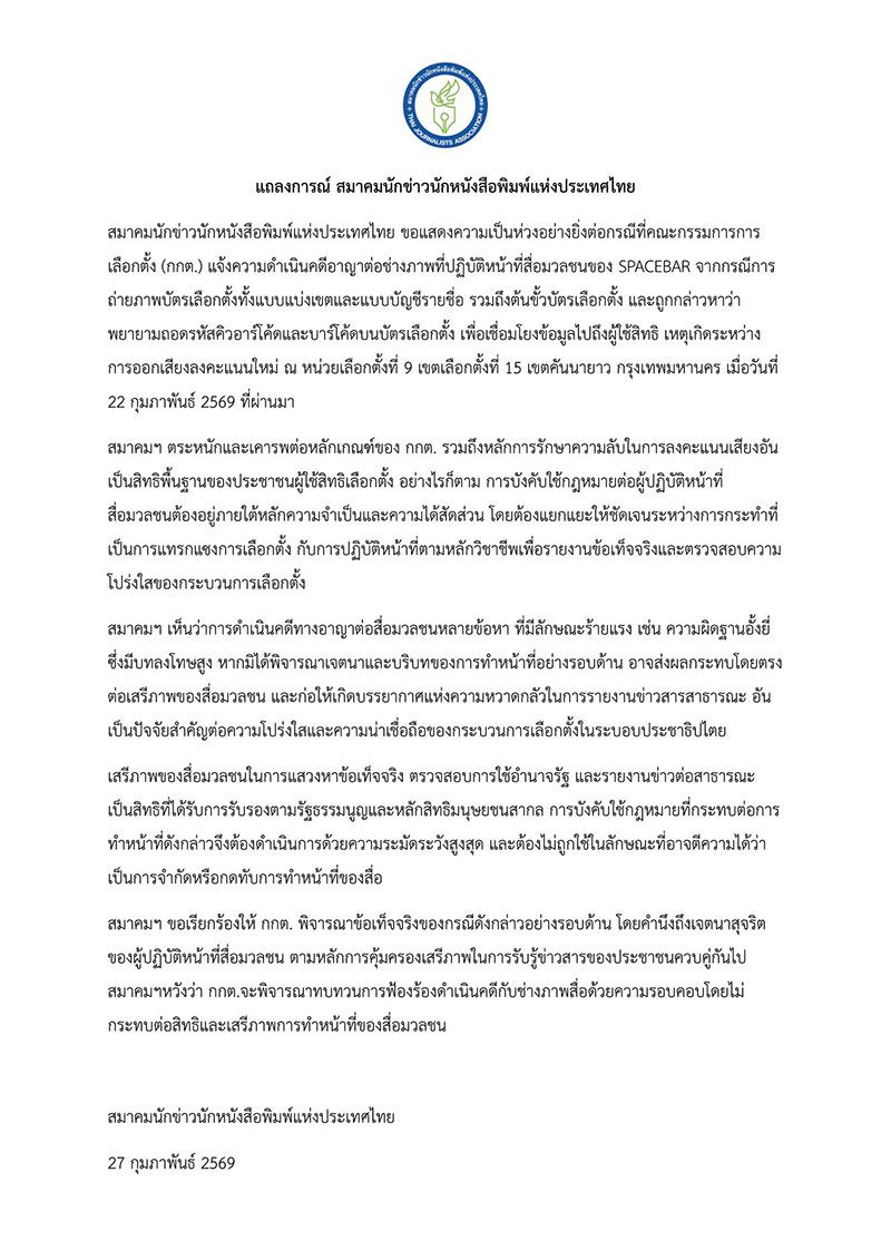 สมาคมนักข่าวนักหนังสือพิมพ์แห่งประเทศไทย ขอแสดงความเป็นห่วงอย่างยิ่งต่อกรณีที่คณะกรรมการการเลือกตั้ง (กกต.) แจ้งความดำเนินคดีอาญาต่อช่างภาพที่ปฏิบัติหน้าที่สื่อมวลชนของ SPACEBAR จากกรณีการถ่ายภาพบัตรเลือกตั้งทั้งแบบแบ่งเขตและแบบบัญชีรายชื่อ รวมถึงต้นขั้วบัตรเลือกตั้ง และถูกกล่าวหาว่าพยายามถอดรหัสคิวอาร์โค้ดและบาร์โค้ดบนบัตรเลือกตั้ง เพื่อเชื่อมโยงข้อมูลไปถึงผู้ใช้สิทธิ เหตุเกิดระหว่างการออกเสียงลงคะแนนใหม่ ณ หน่วยเลือกตั้งที่ 9 เขตเลือกตั้งที่ 15 เขตคันนายาว กรุงเทพมหานคร เมื่อวันที่ 22 กุมภาพันธ์ 2569 ที่ผ่านมา
