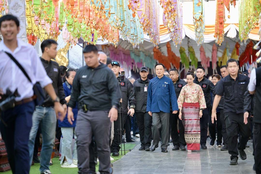 ต่อมาเวลา 17.32 น. นายกฯ , น.ส.ธนนนท์ นิรามิษ ภริยา และคณะ เดินทางมาถึงวัดพระธาตุช่อแฮ โดยรถ Toyota Alphard ทะเบียน 3 ขล 2499 กรุงเทพมหานคร โดยสวมเสื้อม่อฮ่อมพื้นเมือง โดยมีประชาชนสวมชุดพื้นเมือง “ผ้าม่อฮ่อม” และม่อฮ่อมร่วมสมัย ที่ผสมผสานกับผ้าทอ ผ้าปัก มีความทันสมัย สวยงาม และคงเอกลักษณ์ของท้องถิ่น และมี น.ส.ชนกนันท์ ศุภศิริ สส.แพร่ เขต 1 พรรคภูมิใจไทย , นายชนาธิป ศุภศิริ สส.แพร่ เขต 2 พรรคภูมิใจไทย รวมถึง นางศิริวรรณ ปราศจากศัตรู หรือ “แม่เลี้ยงติ๊ก” ผู้สมัคร สส.แบบบัญชีรายชื่อ พรรคภูมิใจไทย และอดีต สส.แพร่ หลายสมัย รอต้อนรับ