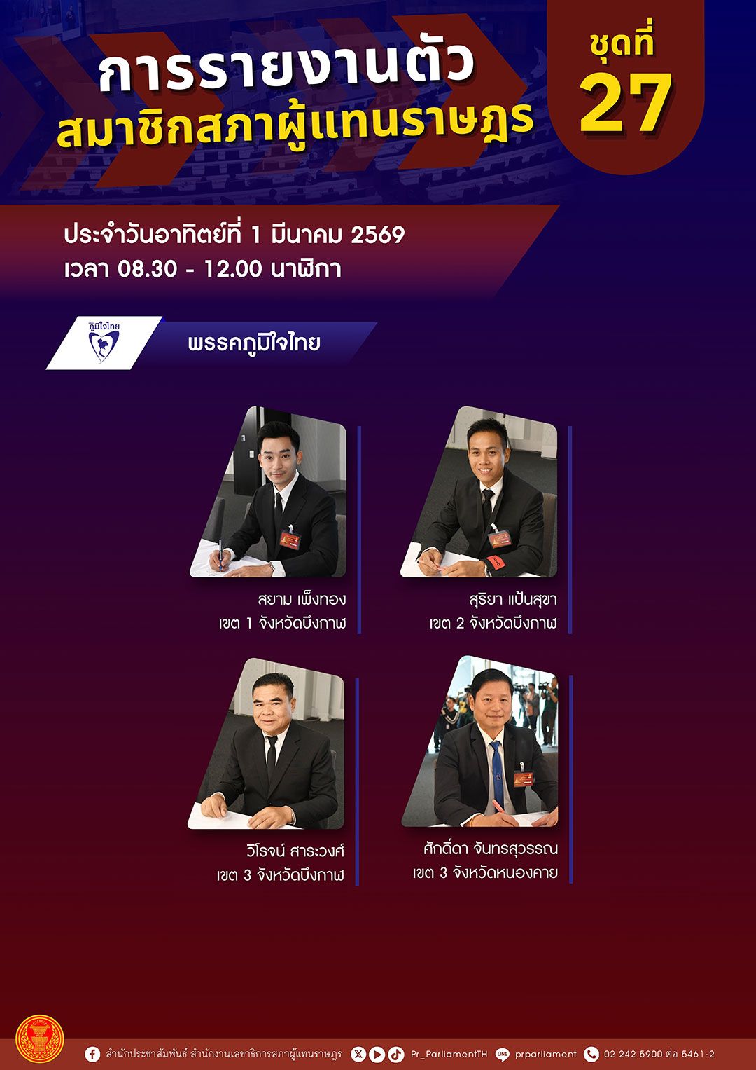 1 มีนาคม 2569 ที่รัฐสภา ผู้สื่อข่าวรายงานการเปิดรับรายงานตัวสมาชิกสภาผู้แทนราษฎร (สส.) แบบแบ่งเขต ชุดที่ 27 ต่อสำนักงานเลขาธิการสภาผู้แทนราษฎร ในวันนี้ (1 มี.ค.) ซึ่งเปิดให้รายงานตัวเป็นวันที่ 4 มี สส.เข้ารายงานตัวเพิ่มเติม จำนวน 4 คน ในช่วงเช้าก่อนเวลา 12.00 น.ประกอบด้วย นายสยาม เพ็งทอง สส.บึงกาฬ พรรคภูมิใจไทย , นายสุริยา แป้นสุจา สส.บึงกาฬ พรรคภูมิใจไทย , นายวิโรจน์ สาระวงศ์ สส.บึงกาฬ พรรคภูมิใจไทย และ นายศักดิ์ดา จันทรสุวรรณ สส.หนองคาย พรรคภูมิใจไทย