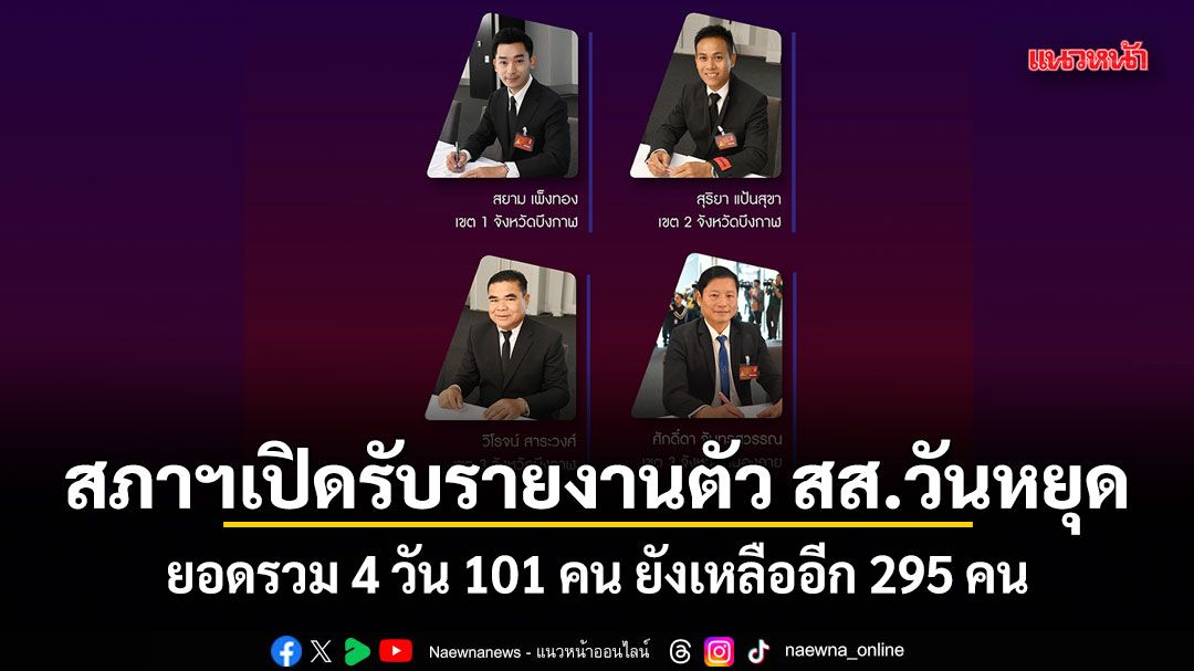ทั้งนี้ ตลอดทั้ง 4 วัน มี สส.มารายงานตัวแล้ว 101 คน ยังเหลืออีก 295 คน ตามที่คณะกรรมการการเลือกตั้ง (กกต.) ประกาศรับรอง สส.แบบแบ่งเขต 396 คน โดยแต่ละพรรคการเมือง ประกอบด้วย