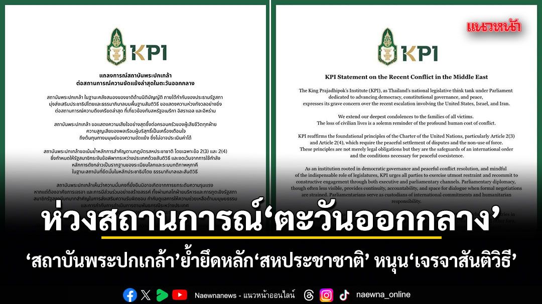 The King Prajadhipok’s Institute (KPI), as Thailand’s national legislative think tank under Parliament dedicated to advancing democracy, constitutional governance, and peace, expresses its grave concern over the recent escalation involving the United States, Israel, and Iran.