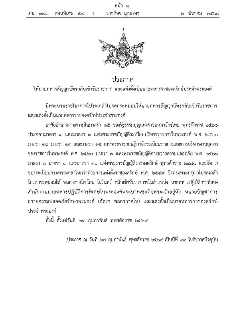 วันที่ 2 มีนาคม 2569 เว็บไซต์ราชกิจจานุเบกษา เผยแพร่ พระบรมราชโองการ ประกาศให้นายทหารสัญญาบัตรกลับเข้ารับราชการ และแต่งตั้งเป็นนายทหารราชองครักษ์ประจำพระองค์