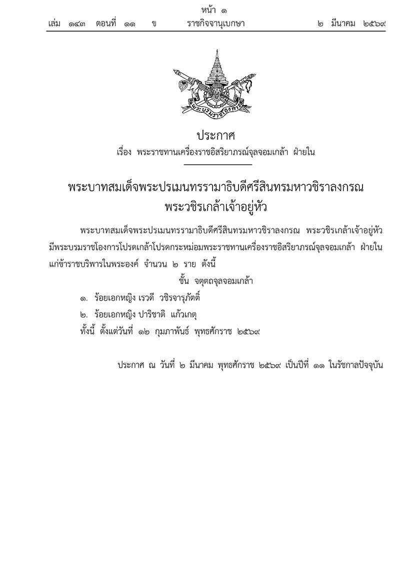 วันที่ 2 มีนาคม 2569 เว็บไซต์ราชกิจจานุเบกษา เผยแพร่ประกาศ เรื่อง พระราชทานเครื่องราชอิสริยาภรณ์จุลจอมเกล้า ฝ่ายใน