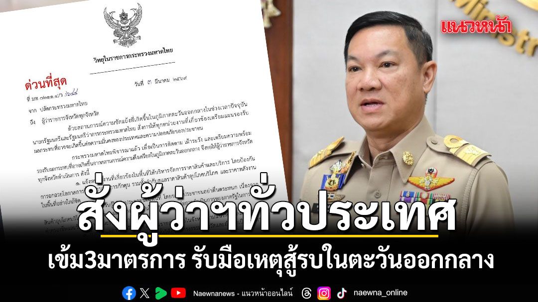 ‘มท.’ สั่ง ‘ผู้ว่าฯ ทั่วประเทศ’ เข้ม3มาตรการ ‘กำกับราคาสินค้าอุปโภคบริโภค-พลังงาน-สร้างการรับรู้ไม่ตื่นตระหนก-กำกับดูแลการปฏิบัติราชการ’ เปิด ‘ศูนย์ดำรงธรรมจังหวัด-อำเภอ’ รับแจ้งกรณีได้รับผลกระทบจากสถานการณ์ในตะวันออกกลาง