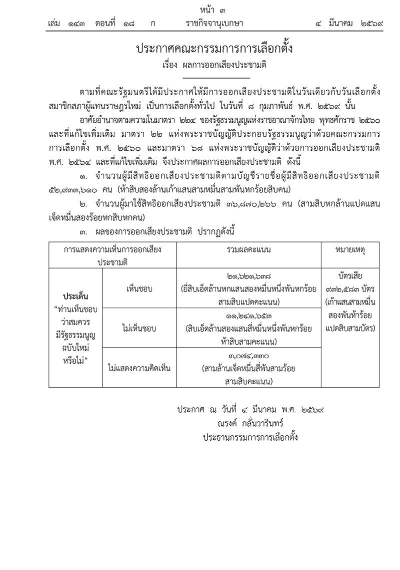 วันที่ 4 มีนาคม 2569 เว็บไซต์ราชกิจจานุเบกษา เผยแพร่ประกาศคณะกรรมการการเลือกตั้ง เรื่อง ผลการออกเสียงประชามติ