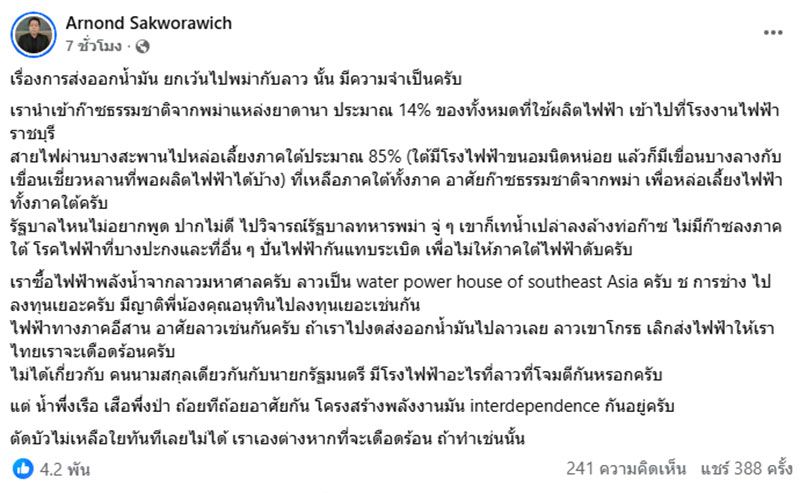 วันที่ 7 มีนาคม 2569 รศ.ดร.อานนท์ ศักดิ์วรวิชญ์ อาจารย์ประจำคณะสถิติประยุกต์ สถาบันบัณฑิตพัฒนบริหารศาสตร์ (นิด้า) โพสต์ข้อความผ่านเฟซบุ๊ก Arnond Sakworawich เรื่องการส่งออกน้ำมัน ยกเว้นไปพม่ากับลาว นั้น มีความจำเป็นครับ