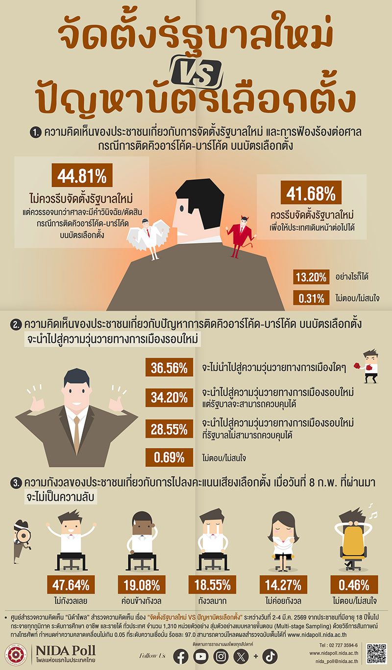 8 มีนาคม 2569 ศูนย์สำรวจความคิดเห็น “นิด้าโพล” สถาบันบัณฑิตพัฒนบริหารศาสตร์ (นิด้า) เปิดเผยผลการสำรวจ เรื่อง “จัดตั้งรัฐบาลใหม่ VS ปัญหาบัตรเลือกตั้ง” ทำการสำรวจระหว่างวันที่ 2-4 มีนาคม 2569 จากประชาชนที่มีอายุ 18 ปีขึ้นไป กระจายทุกภูมิภาค ระดับการศึกษา อาชีพ และรายได้ ทั่วประเทศ รวมจำนวนทั้งสิ้น 1,310 หน่วยตัวอย่าง เกี่ยวกับความคิดเห็นของประชาชนต่อประเด็นการจัดตั้งรัฐบาลใหม่และปัญหาบัตรเลือกตั้งหลังการเลือกตั้งการสำรวจอาศัยการสุ่มตัวอย่างโดยใช้ความน่าจะเป็นจากบัญชีรายชื่อฐานข้อมูลตัวอย่างหลัก (Master Sample)ของ “นิด้าโพล” สุ่มตัวอย่างแบบหลายขั้นตอน (Multi-stage Sampling) เก็บข้อมูลด้วยวิธีการสัมภาษณ์ทางโทรศัพท์ โดยกำหนดค่าความคลาดเคลื่อนไม่เกิน 0.05 ที่ระดับความเชื่อมั่น ร้อยละ 97.0