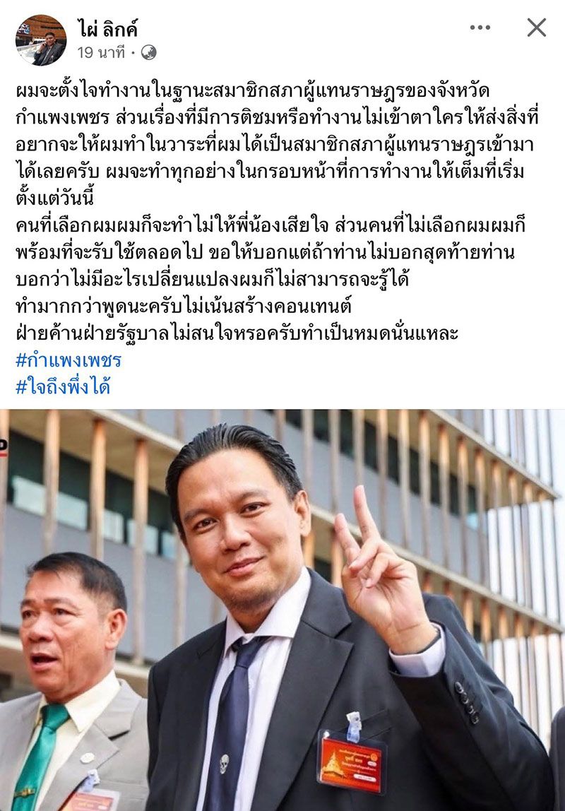 เมื่อวันที่ 8 มีนาคม 2569 นายไผ่ ลิกค์ สส.กำแพงเพชร พรรคกล้าธรรม โพสต์ข้อความผ่านเฟซบุ๊กส่วนตัว ระบุถึงแนวทางการทำหน้าที่ ส.ส. โดยย้ำชัดว่า การทำงานเพื่อประชาชนไม่จำเป็นต้องยึดติดว่าอยู่ฝ่ายรัฐบาลหรือฝ่ายค้านโดยตนจะตั้งใจทำงานในฐานะสมาชิกสภาผู้แทนราษฎรของจังหวัดกำแพงเพชรอย่างเต็มที่ พร้อมเปิดรับข้อเสนอแนะจากประชาชน หากมีสิ่งใดที่อยากให้ดำเนินการในวาระที่ตนทำหน้าที่ ส.ส. สามารถส่งเข้ามาได้ และจะทำทุกอย่างภายใต้กรอบหน้าที่อย่างเต็มกำลังตั้งแต่วันนี้เป็นต้นไป