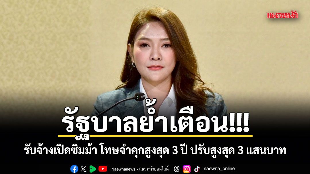 รัฐบาลย้ำเตือน รับจ้างเปิด“ซิมม้า” โทษจำคุกสูงสุด 3 ปี ปรับสูงสุด 3 แสนบาท เป็นธุระจัดหา โฆษณา ชักชวนให้มีการซื้อขาย ให้เช่า หรือให้ยืมซิม โทษจำคุกสูงสุด 5 ปี ปรับสูงสุด 5 แสนบาท