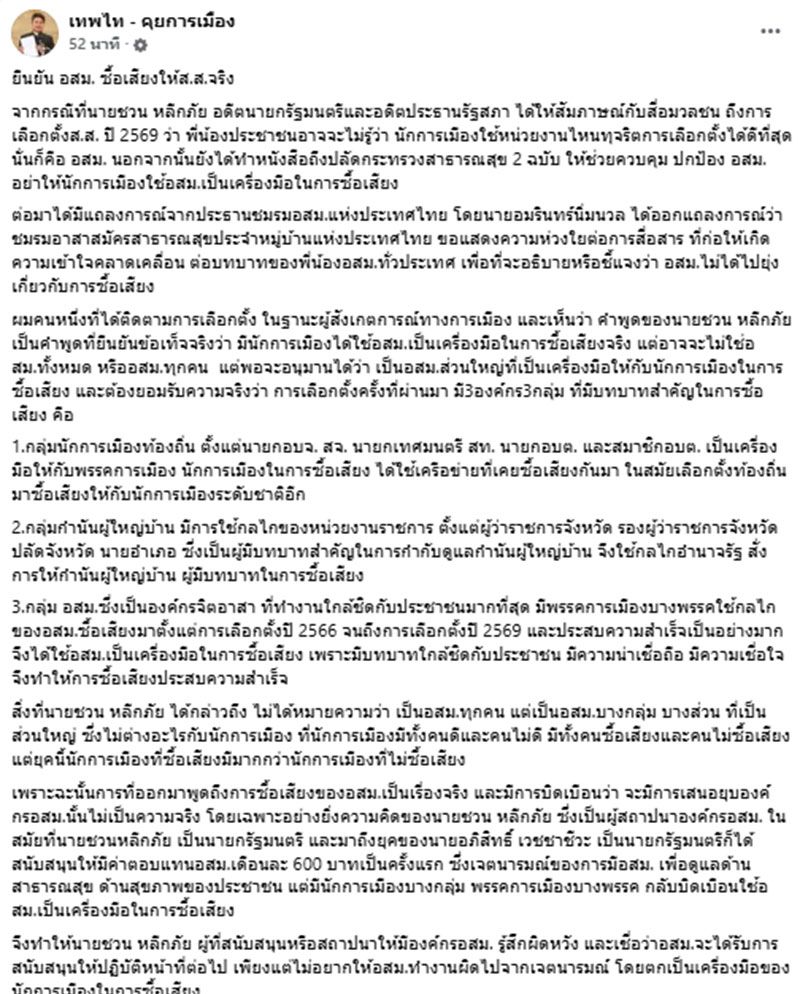 วันที่ 11 มีนาคม 2569 นายเทพไท เสนพงศ์ อดีต สส.นครศรีธรรมราช โพสต์ข้อความผ่านเฟซบุ๊ก "เทพไท - คุยการเมือง" ระบุว่า “ยืนยัน อสม. ซื้อเสียงให้ สส.จริง”