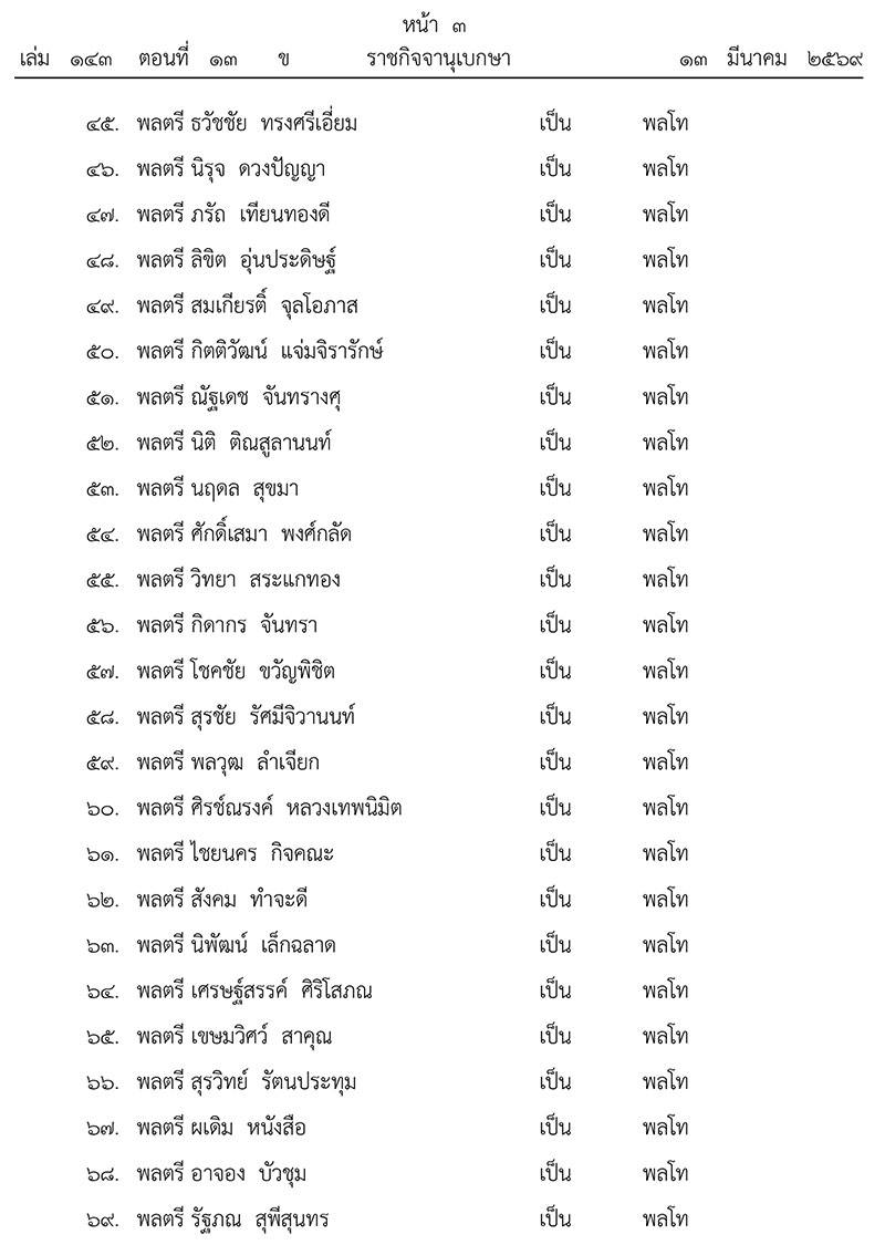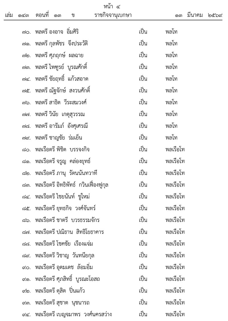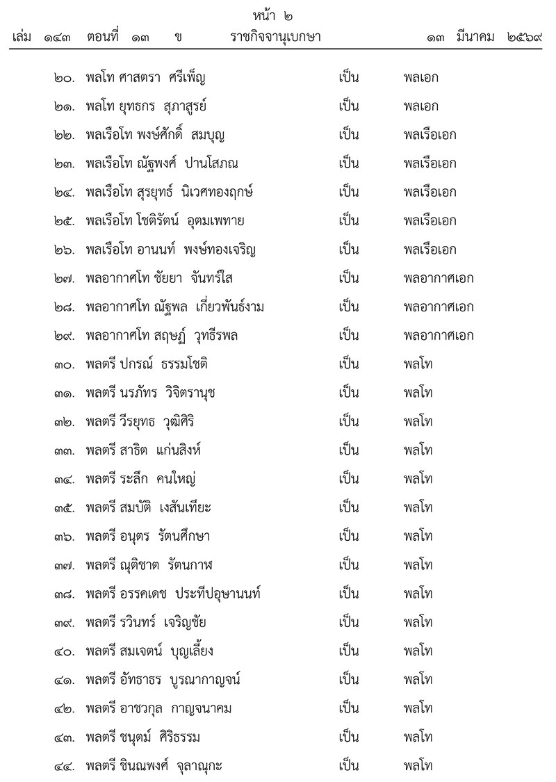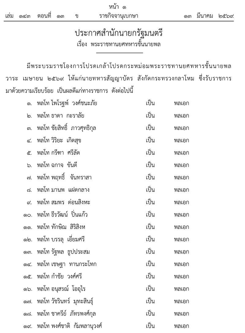 วันที่ 14 มีนาคม 2569 เว็บไซต์ราชกิจจานุเบกษา เผยแพร่ประกาศสำนักนายกรัฐมนตรีเรื่อง พระราชทานยศทหารชั้นนายพล