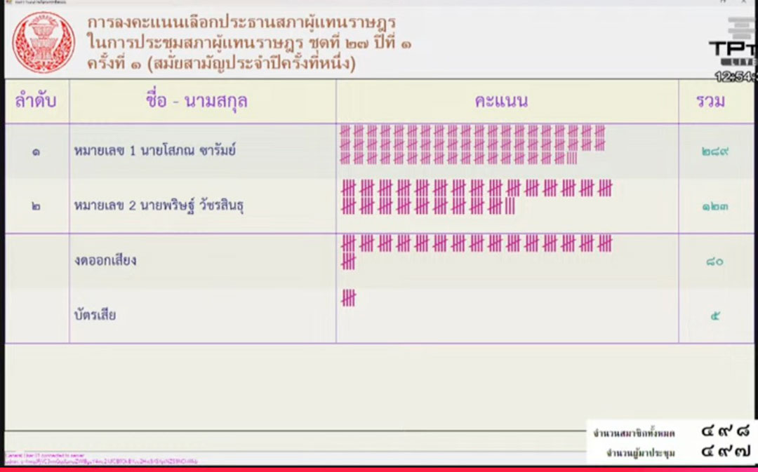 ตามคาด! "โสภณ ซารัมย์"จาก"ภูมิใจไทย"นั่ง"ประธานสภาฯ" เสียงหนุนท่วมท้น 289 เสียง ด้าน"พริษฐ์" 123 เสียง งดออกเสียง 80 บัตรเสีย 5