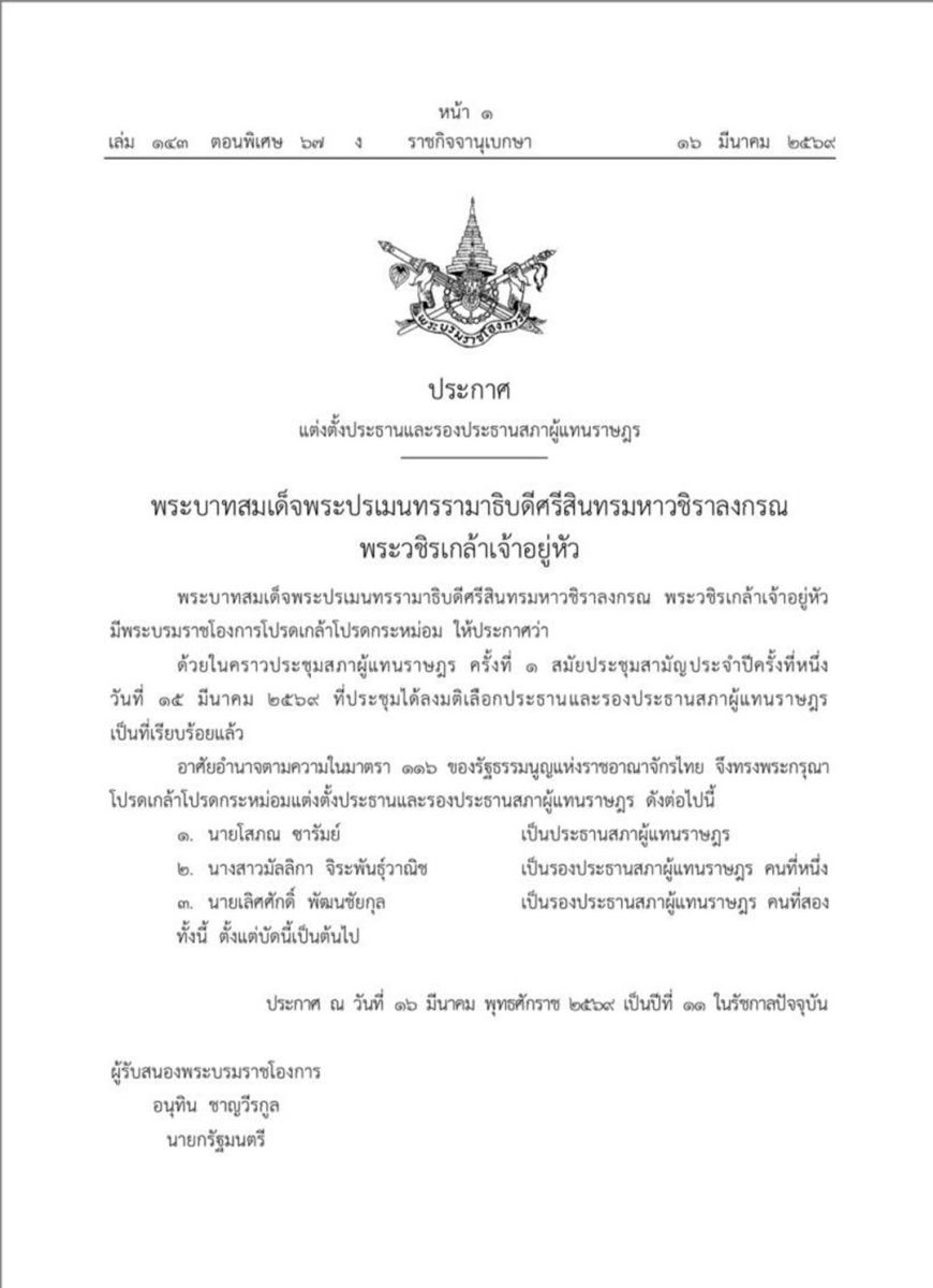 พระบาทสมเด็จพระปรเมนทรรามาธิบดีศรีสินทรมหาวชิราลงกรณ พระวชิรเกล้าเจ้าอยู่หัว มีพระบรมราชโองการโปรดเกล้าโปรดกระหม่อม ให้ประกาศว่า ด้วยในคราวการประชุมสภาผู้แทนราษฎร ครั้งที่ 1 สมัยประชุมสามัญประจำปีครั้งที่หนึ่ง วันที่ 15 มีนาคม 2569 ที่ประชุมได้ลงมติเลือกประธานและรองประธานสภาผู้แทนราษฎรเป็นที่เรียบร้อยแล้ว
