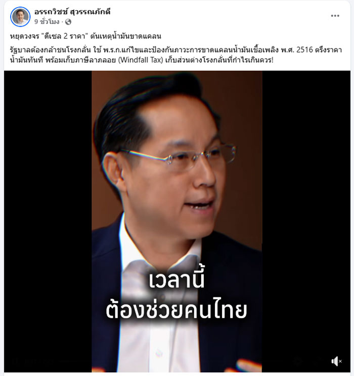 17 มีนาคม 2569 นายอรรถวิชช์ สุวรรณภักดี สส.บัญชีรายชื่อ และรองหัวหน้าพรรครวมไทยสร้างชาติ (รทสช.) โพสต์คลิปวีดีโอ พร้อมข้อความผ่านเฟซบุ๊ก ระบุว่า "หยุดวงจร "ดีเซล 2 ราคา" ต้นเหตุน้ำมันขาดแคลน รัฐบาลต้องกล้าชนโรงกลั่น ใช้ พ.ร.ก.แก้ไขและป้องกันภาวะการขาดแคลนน้ำมันเชื้อเพลิง พ.ศ. 2516 ตรึงราคาน้ำมันทันที พร้อมเก็บภาษีลาภลอย (Windfall Tax) เก็บส่วนต่างโรงกลั่นที่กำไรเกินควร!"