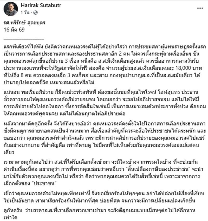 วันที่ 24 กุมภาพันธ์ 2569 รศ.หริรักษ์ สูตะบุตร อดีตรองอธิการบดีฝ่ายบริหารบุคคล มหาวิทยาลัยธรรมศาสตร์ โพสต์ข้อความผ่านเฟซบุ๊ก ระบุว่า แรกทีเดียวที่ได้ฟัง ยังคิดว่าคุณหมอวรงค์ไม่รู้ได้อย่างไรว่า การประชุมสภาผู้แทนราษฎรครั้งแรกเป็นวาระการเลือกประธานสภาและรองประธานสภาอีก 2 คน ไม่ควรตั้งกระทู้ถามเรื่องอื่นๆ ซึ่งคุณหมอวรงค์ลุกขึ้นอภิปราย 3 เรื่อง หนึ่งคือ ส.ส.มีเงินเดือนสูงแล้ว ควรซื้ออาหารกลางวันรับประทานเองแทนที่จะให้รัฐสภาจัดให้ฟรี สองคือ จำนวนผู้ช่วยส.ส.เงินเดือนคนละ 18,000 บาท ที่ให้ถึง 8 คน ควรลดลงเหลือ 3 คนก็พอ และสาม กองทุนบำนาญส.ส.ที่เป็นส.ส.สมัยเดียว ได้บำนาญไปตลอดชีวิต เหมาะสมแล้วหรือไม่