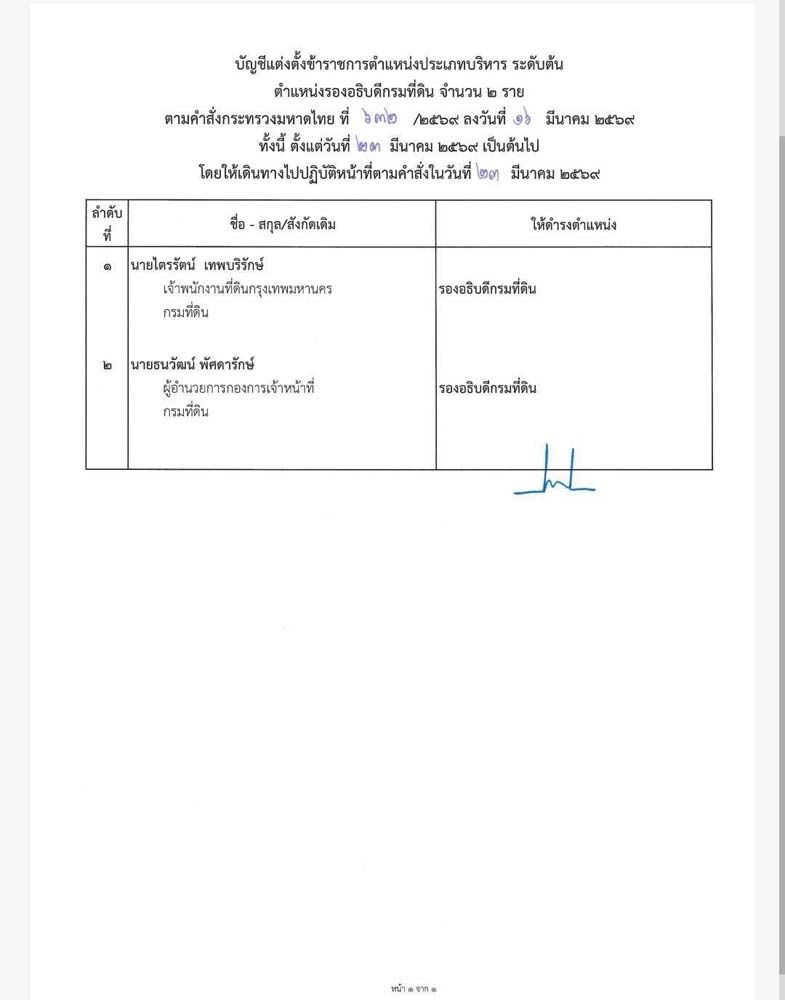 ตำแหน่งรองอธิบดีกรมที่ดิน 2 ราย ได้แก่ 1.นายไตรรัตน์ เทพบริรักษ์ จากตำแหน่งเจ้าพนักงานที่ดินกรุงเทพมหานคร 2.นายธนวัฒน์ พัศดารักษ์ จากตำแหน่งผู้อำนวยการกองการเจ้าหน้าที่ กรมที่ดิน