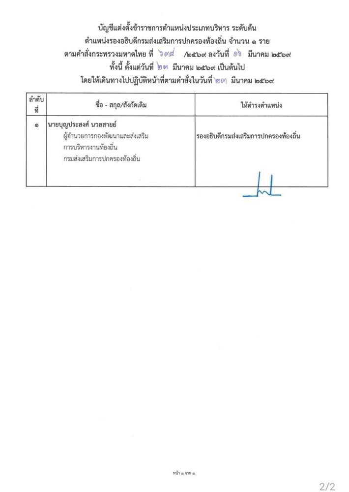"ปลัด มท."เซ็นแต่งตั้ง ขรก.ระดับสูง 6 ตำแหน่ง "ผู้ช่วยปลัดฯ-รองอธิบดีโยธาฯ-ที่ดิน-ส่งเสริมการปกครองท้องถิ่น" เริ่มปฏิบัติหน้าที่ 26 มี.ค.