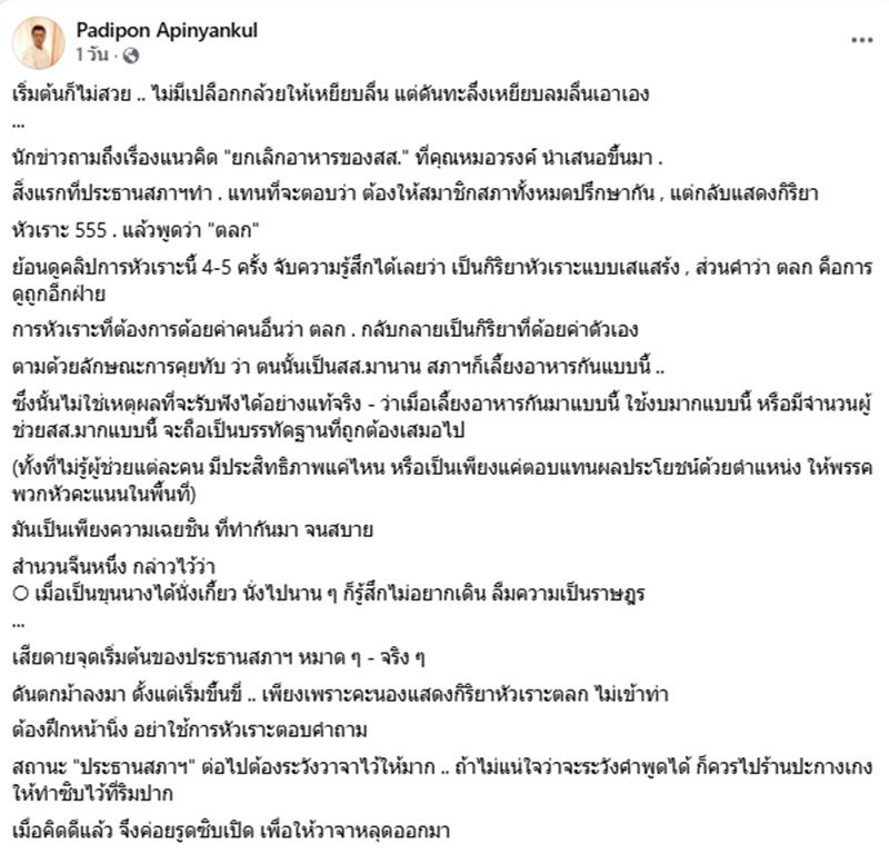 วันที่ 18 มีนาคม 2569 นายปฏิพล อภิญญาณกุล นักเขียนชื่อดัง ได้โพสต์ข้อความลงบนเฟซบุ๊ก "Padipon Apinyankul" ระบุว่า เริ่มต้นก็ไม่สวย .. ไม่มีเปลือกกล้วยให้เหยียบลื่น แต่ดันทะลึ่งเหยียบลมลื่นเอาเอง