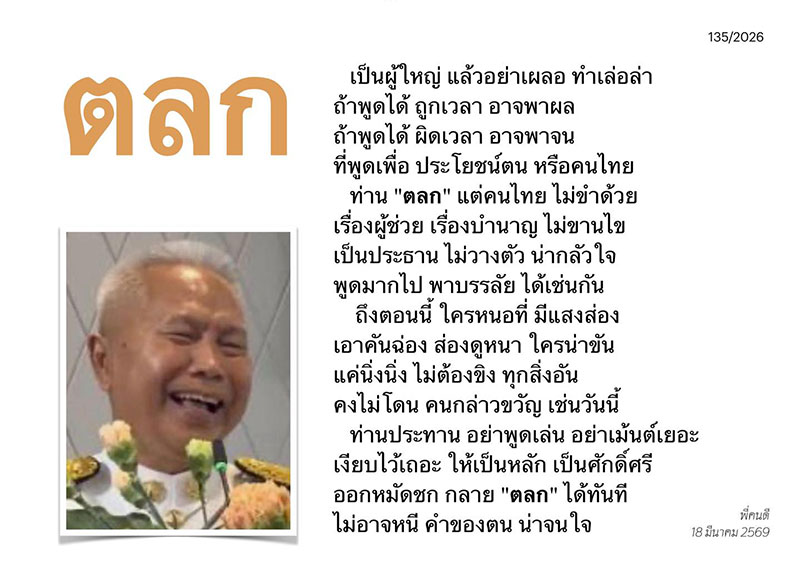 วันที่ 19 มีนาคม 2569 เฟซบุ๊กเพจ 'P.khondee(พี่คนดี กวีสมัครเล่น)' ที่มีผู้ติดตามบนมากกว่า 1.4 แสนราย ได้ออกมาโพสต์บทกลอนว่า ตลก